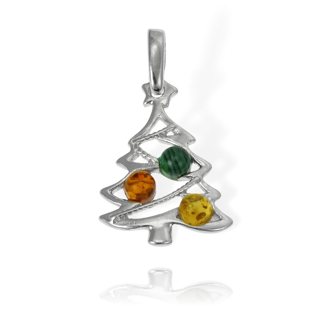 Srebrny Wisiorek Ażurowa Choinka z Bursztynami
