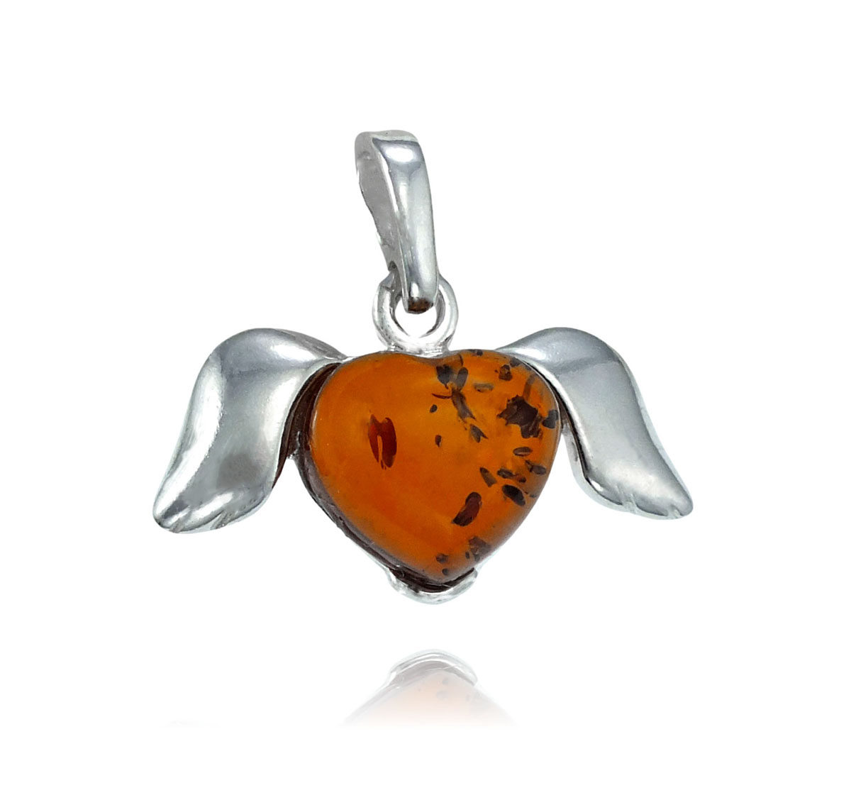 Srebrny Cudowny Wisiorek Bursztynowe Serce ze Skrzydłami Amor