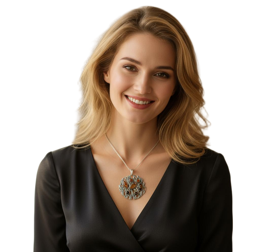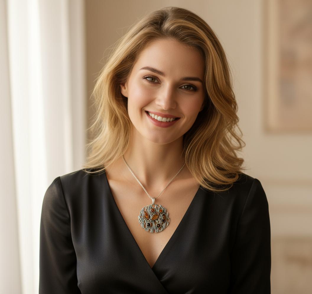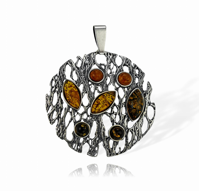Srebrny Oksydowany Ażurowy Fantazyjny Wisiorek z Bursztynem Bursztynami