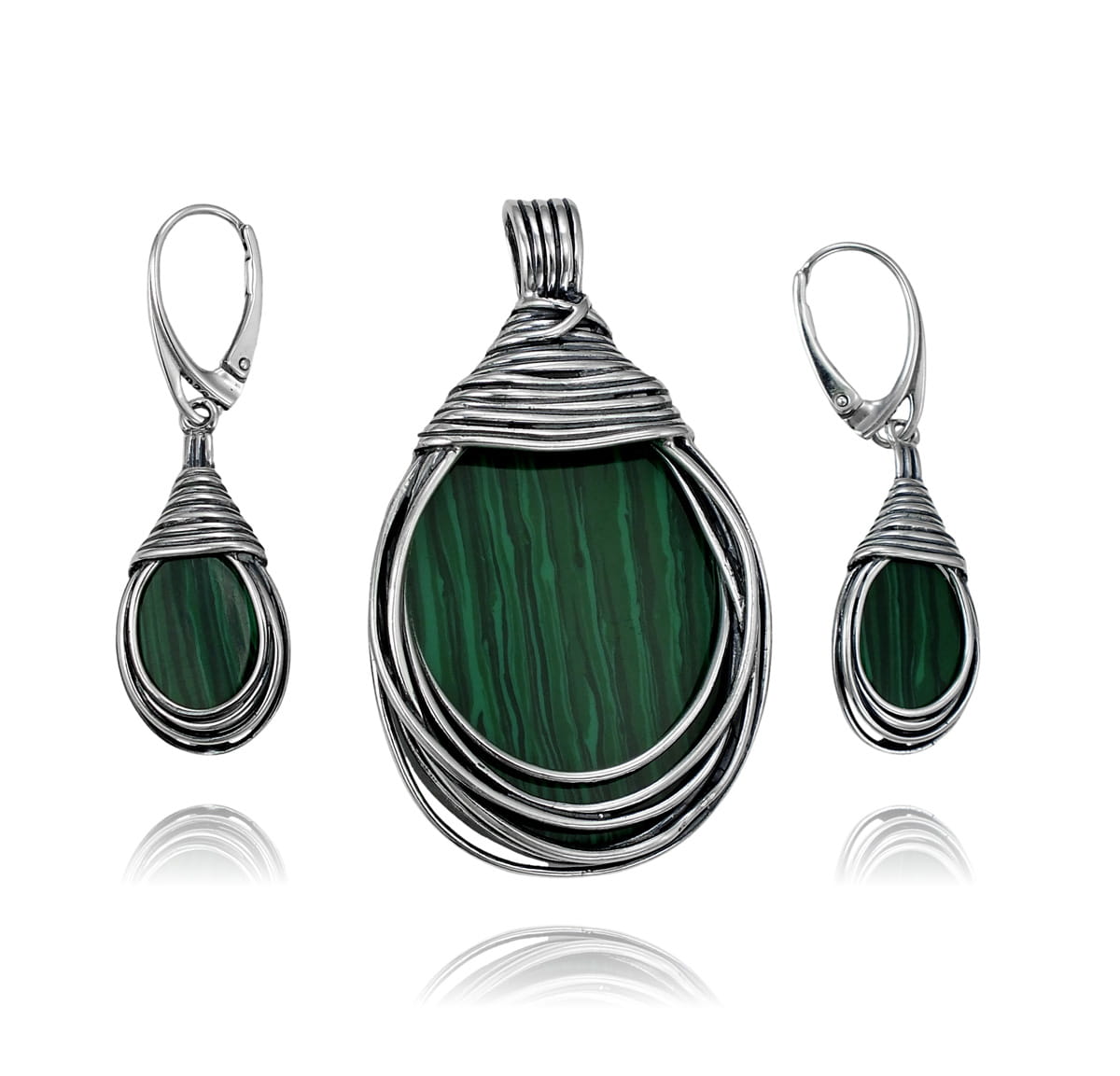 Srebrny Oksydowany Efektowny Komplet z Malachitem Malachitami