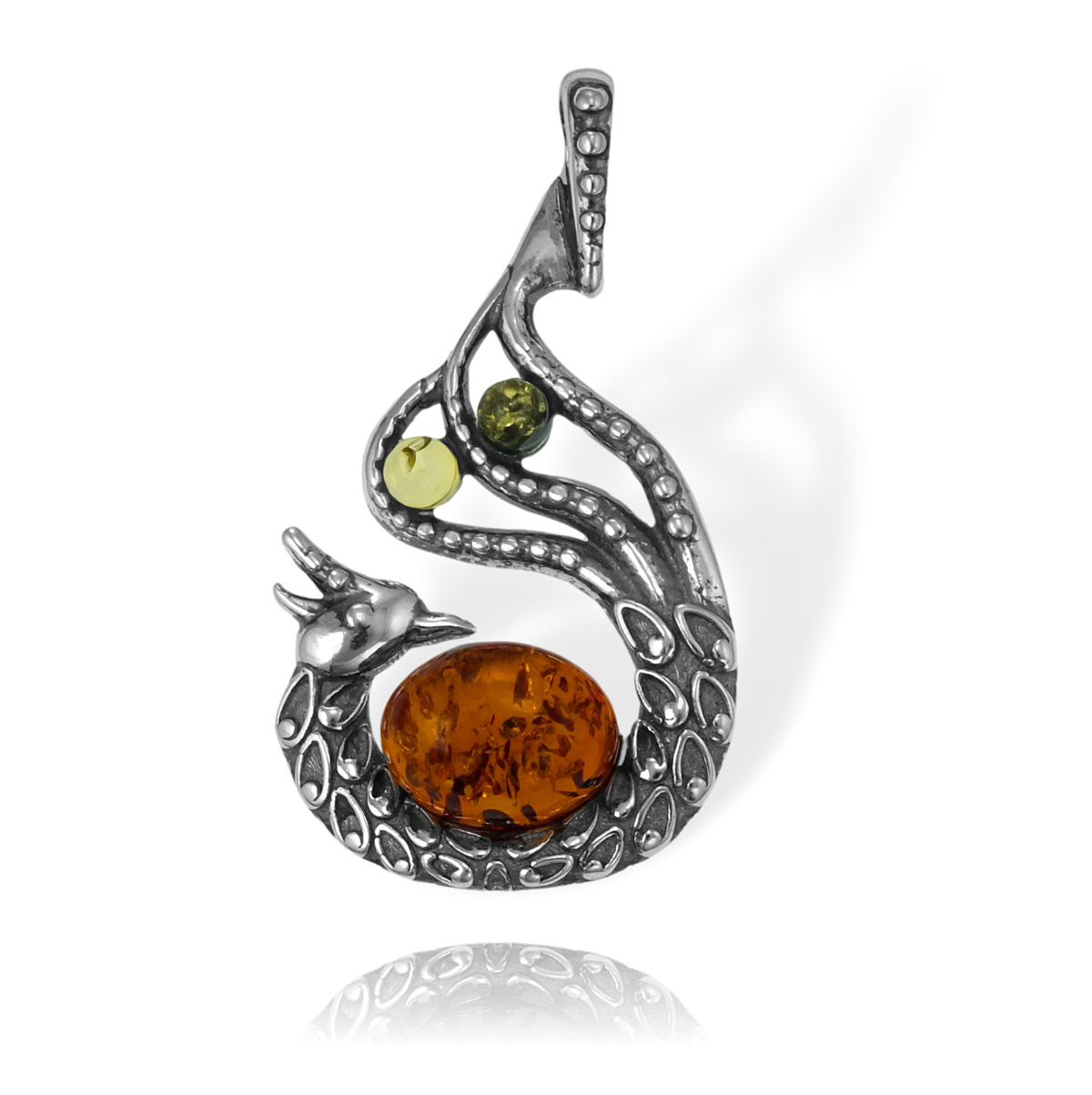 Srebrny Oksydowany Wisiorek Paw z Bursztynami