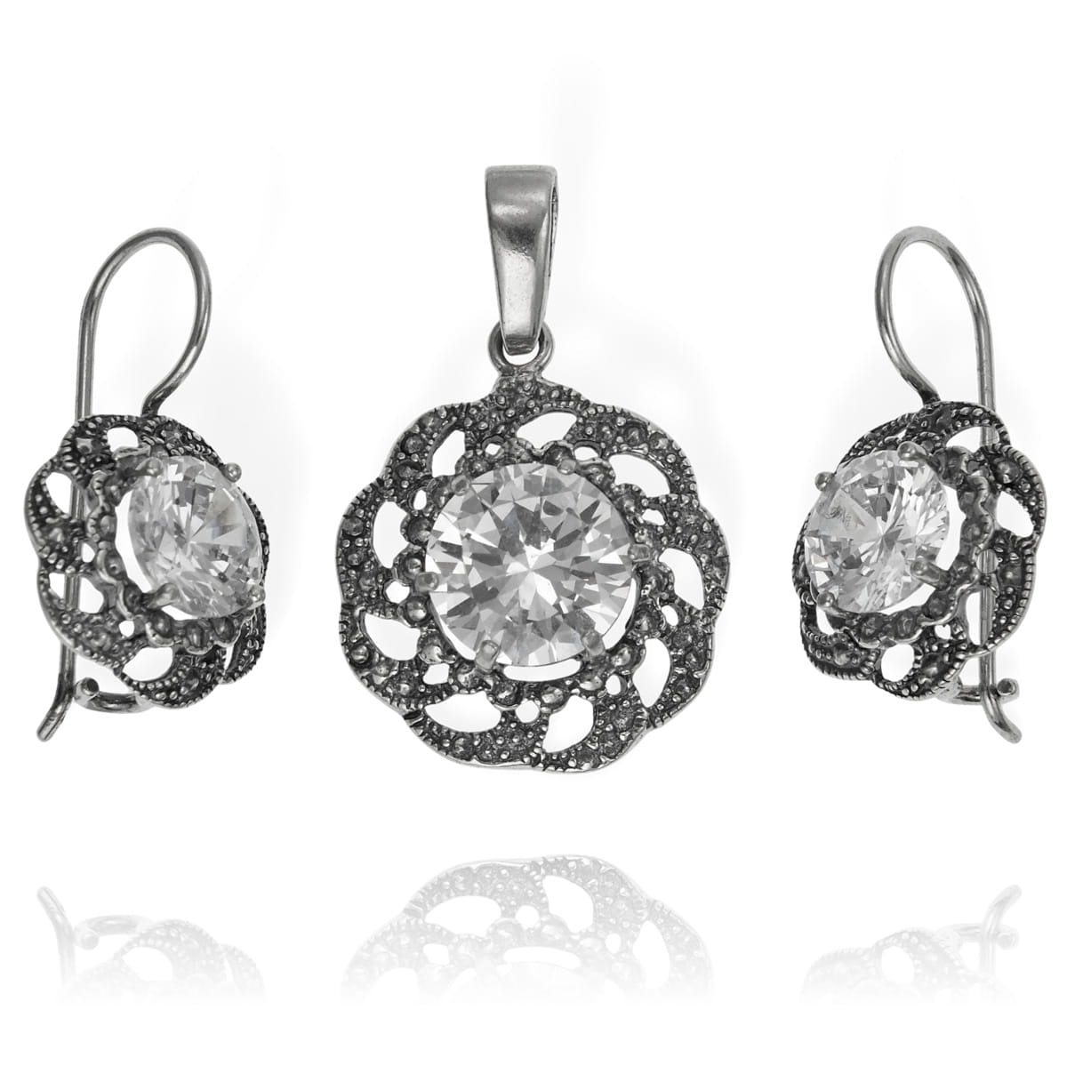 Piękny Srebrny Oksydowany Komplet z Cyrkoniami !