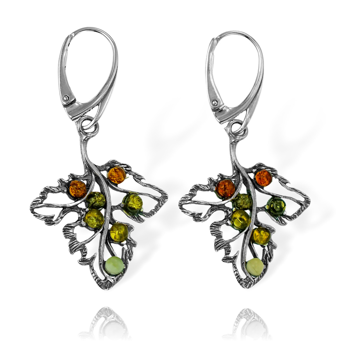 Efektowne Srebrne Kolczyki Liście Listki z Bursztynem Bursztynami