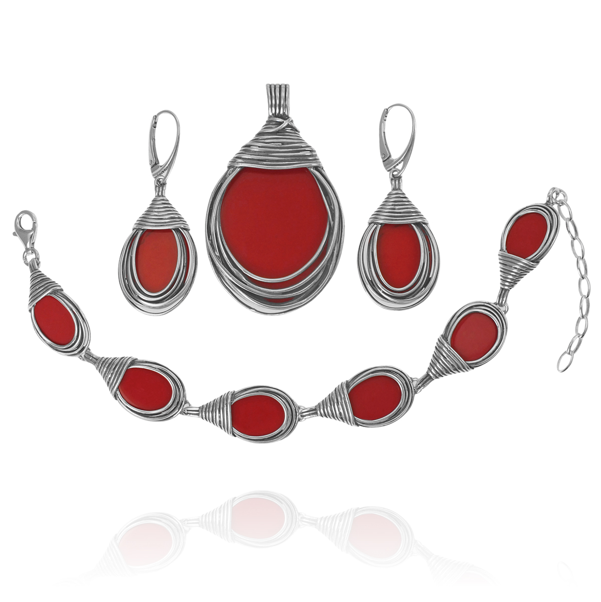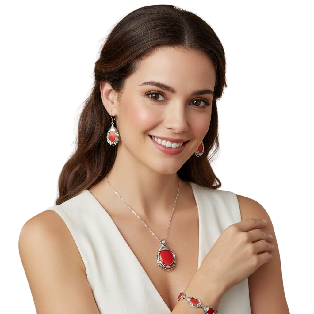 Efektowny Srebrny Oksydowany Komplet z Jaspisem Koralowym
