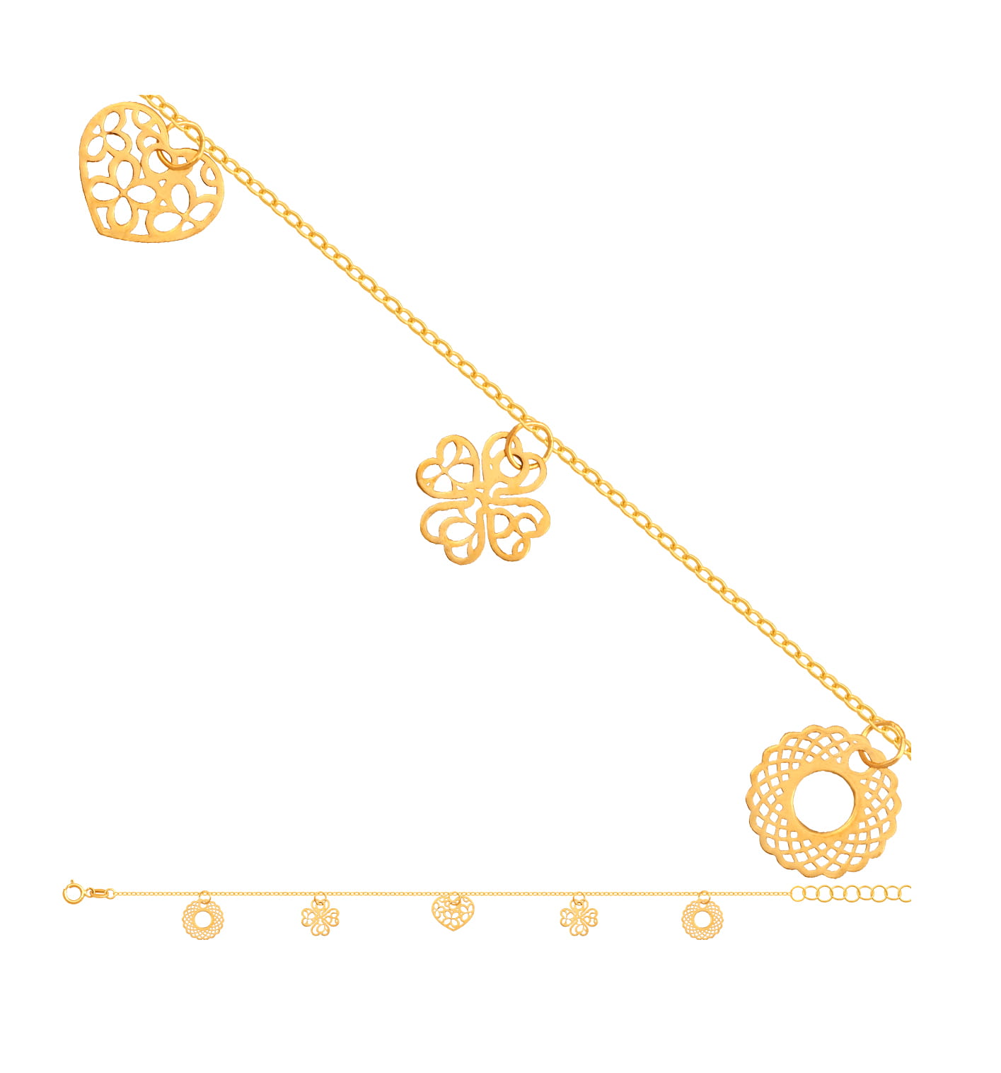 Bransoletka Zdobiona Zawieszkami w Kształcie Serca,Koniczynek i Dwóch Kółeczek Ażurowych
