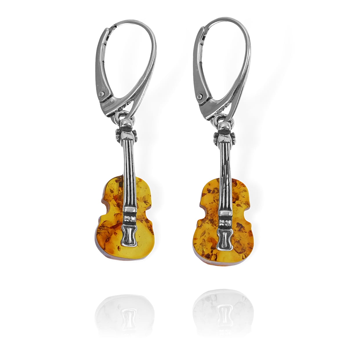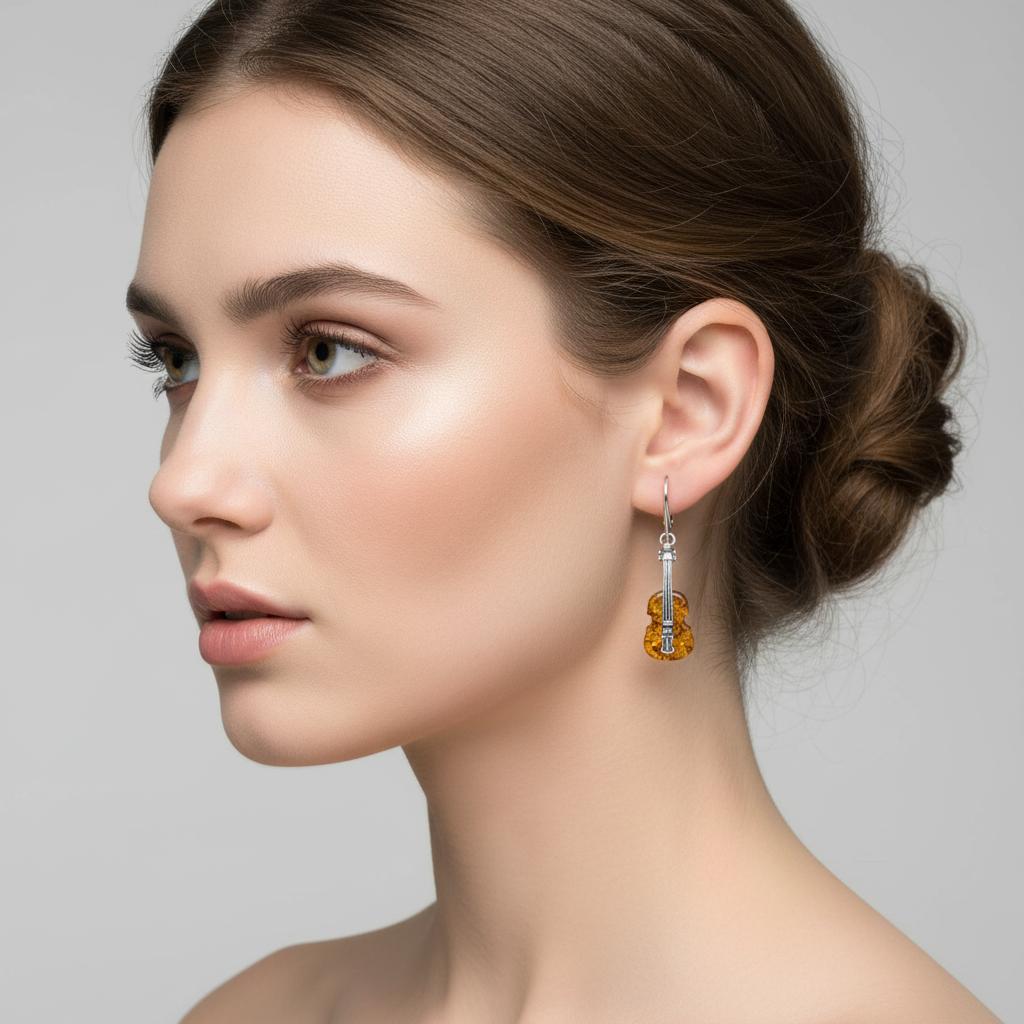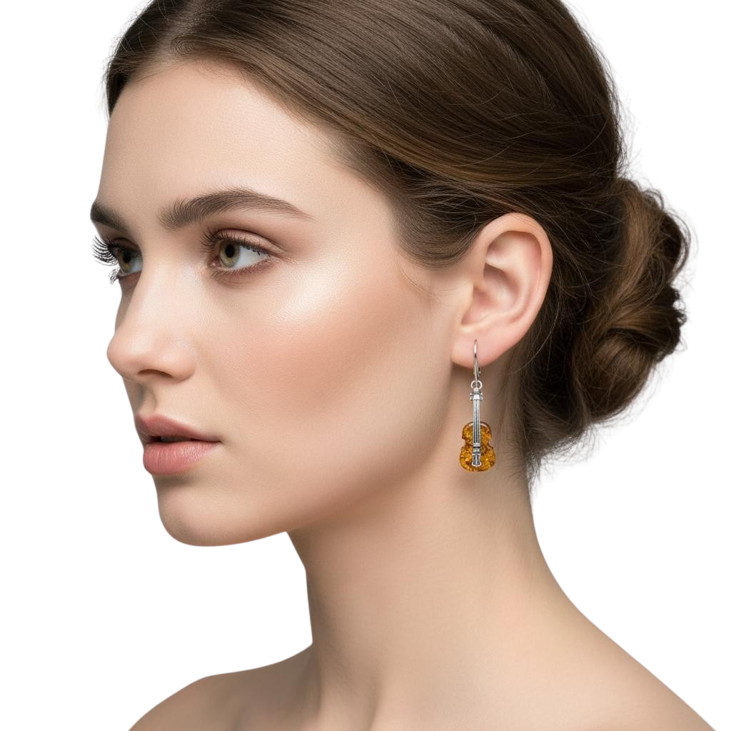 Piękne Srebrne Kolczyki Gitary z Bursztynem