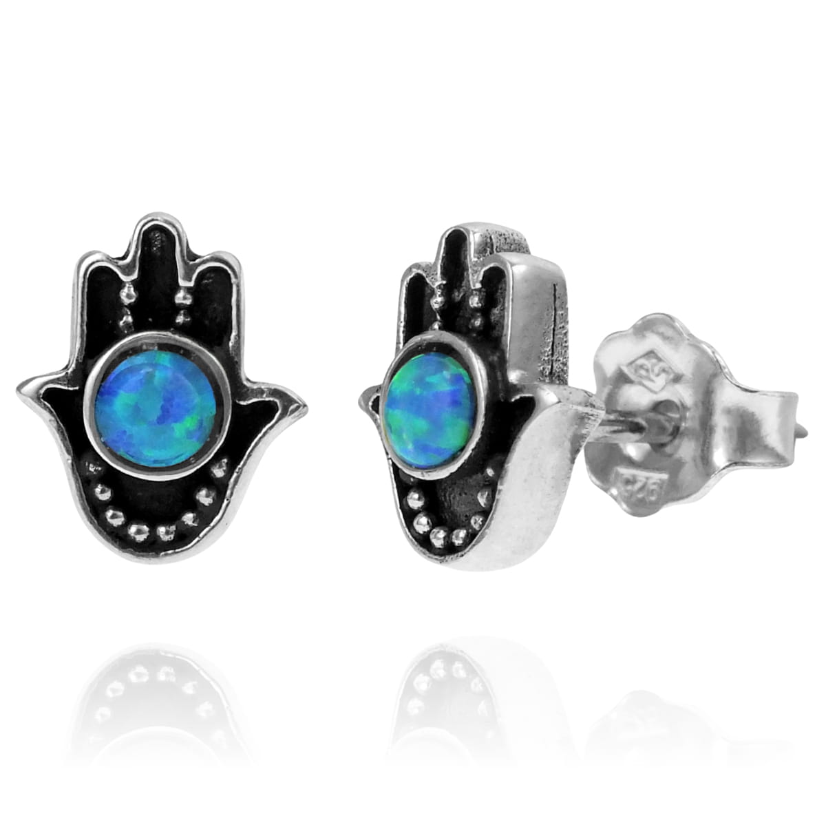 Piękne Srebrne Kolczyki Hamsa, Ręka Fatimy z Opalem