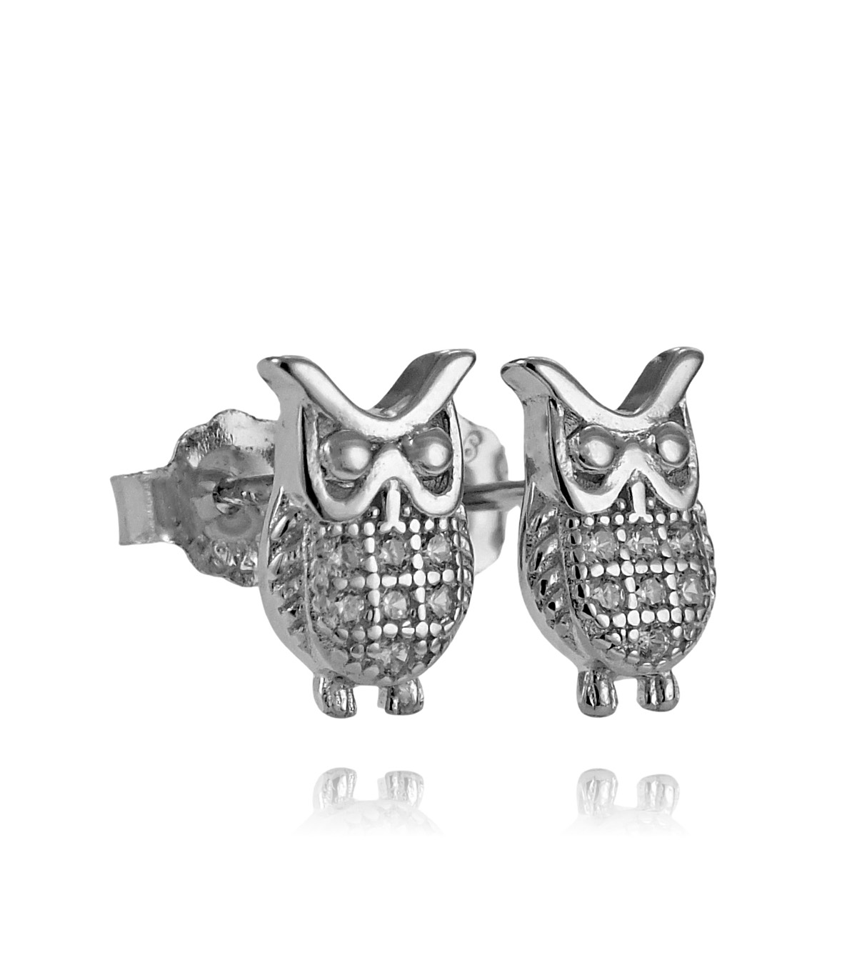 Piękne Srebrne Rodowane Kolczyki Sowy z Cyrkoniami na Sztyft