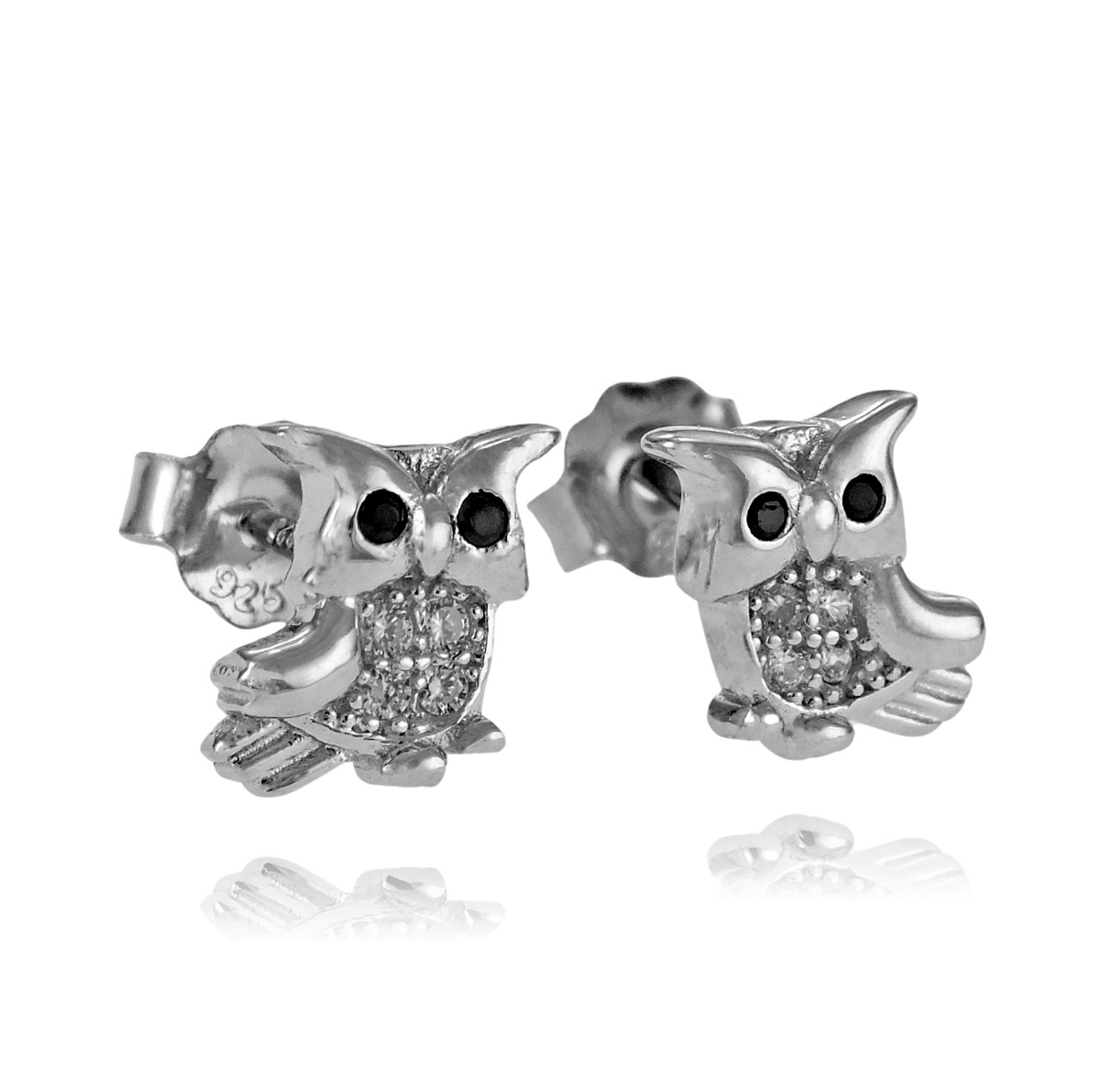 Piękne Srebrne Rodowane Kolczyki Sowy z Cyrkoniami na Sztyft