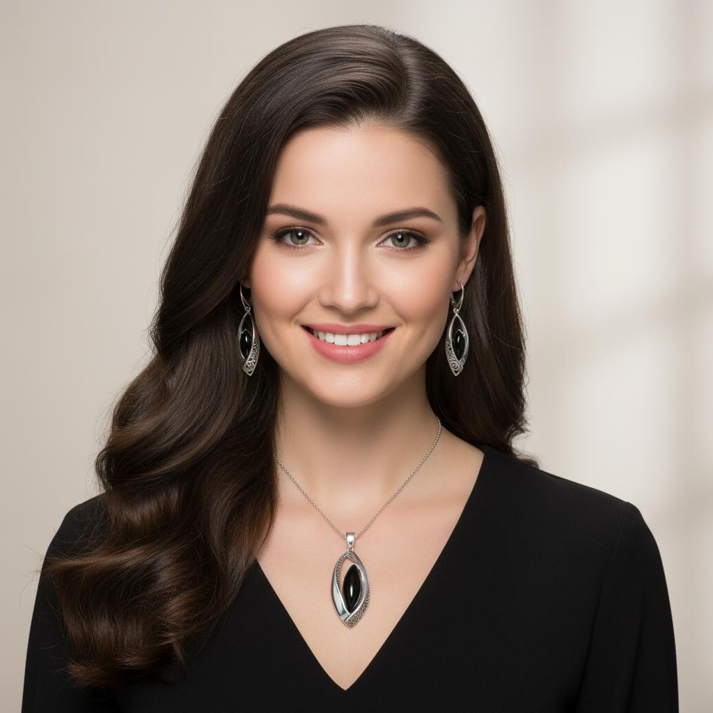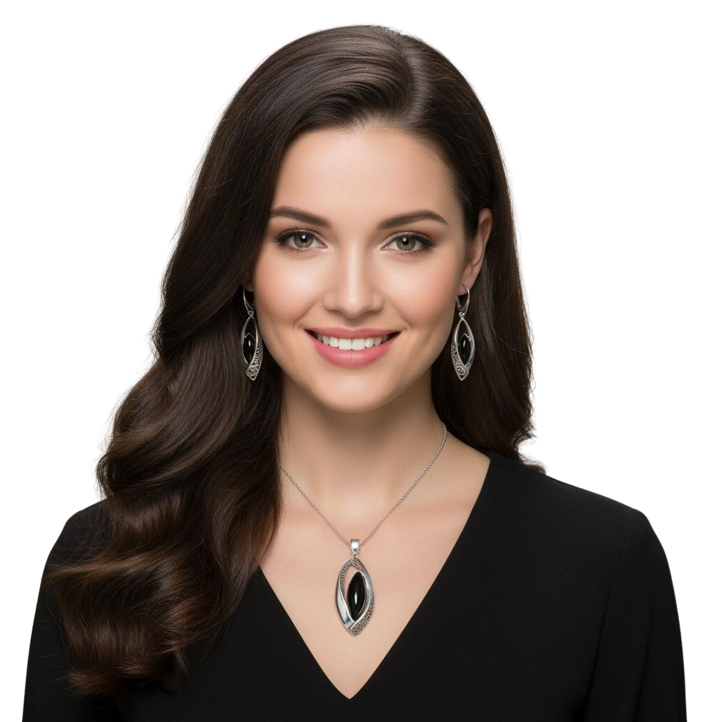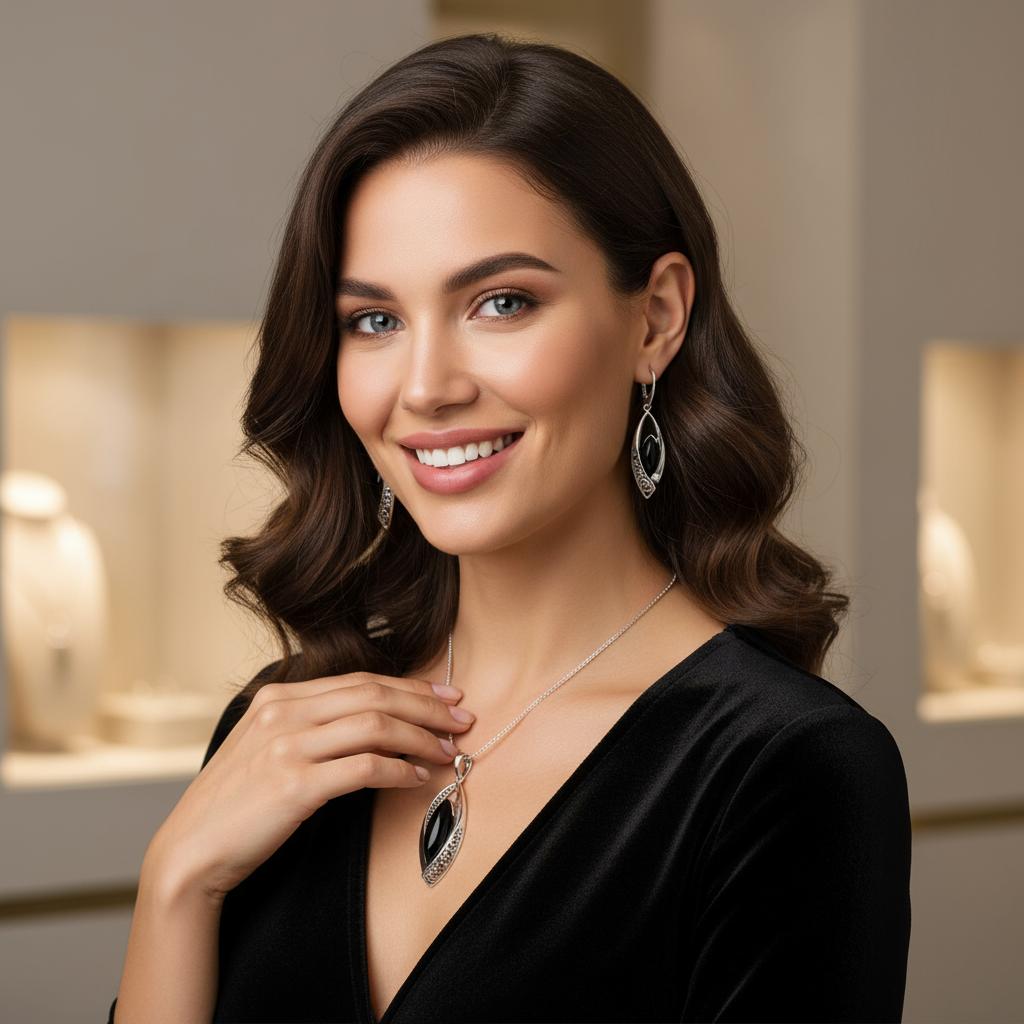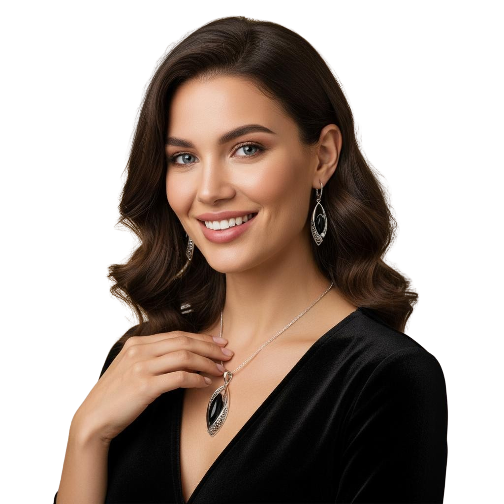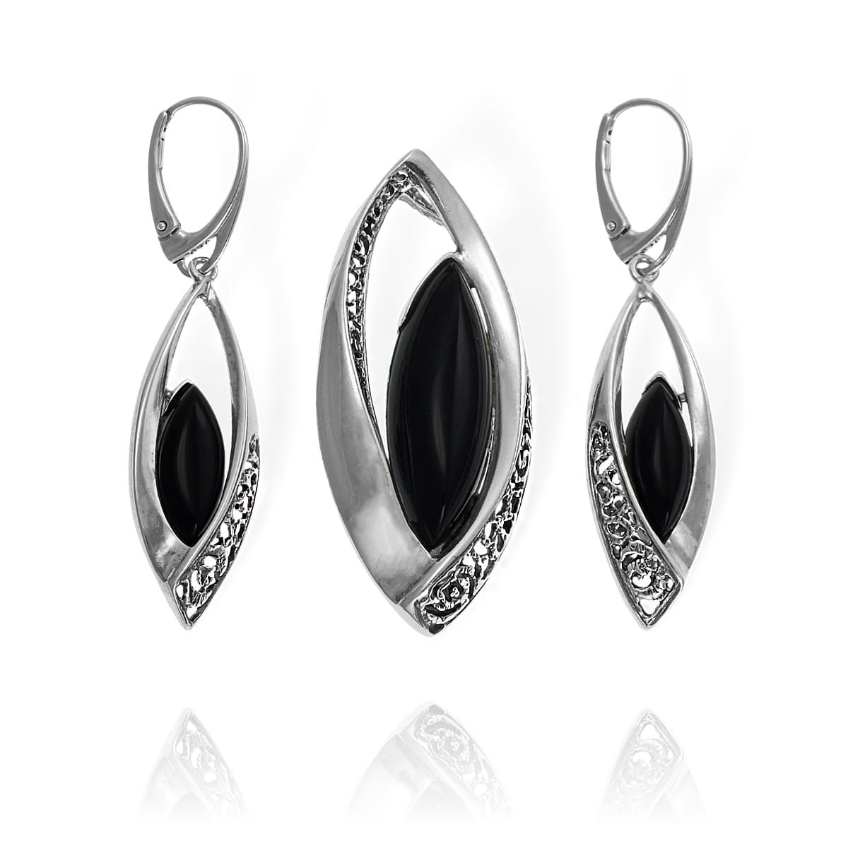 Piękny Srebrny Oksydowany Ażurowy Komplet z Onyksem !