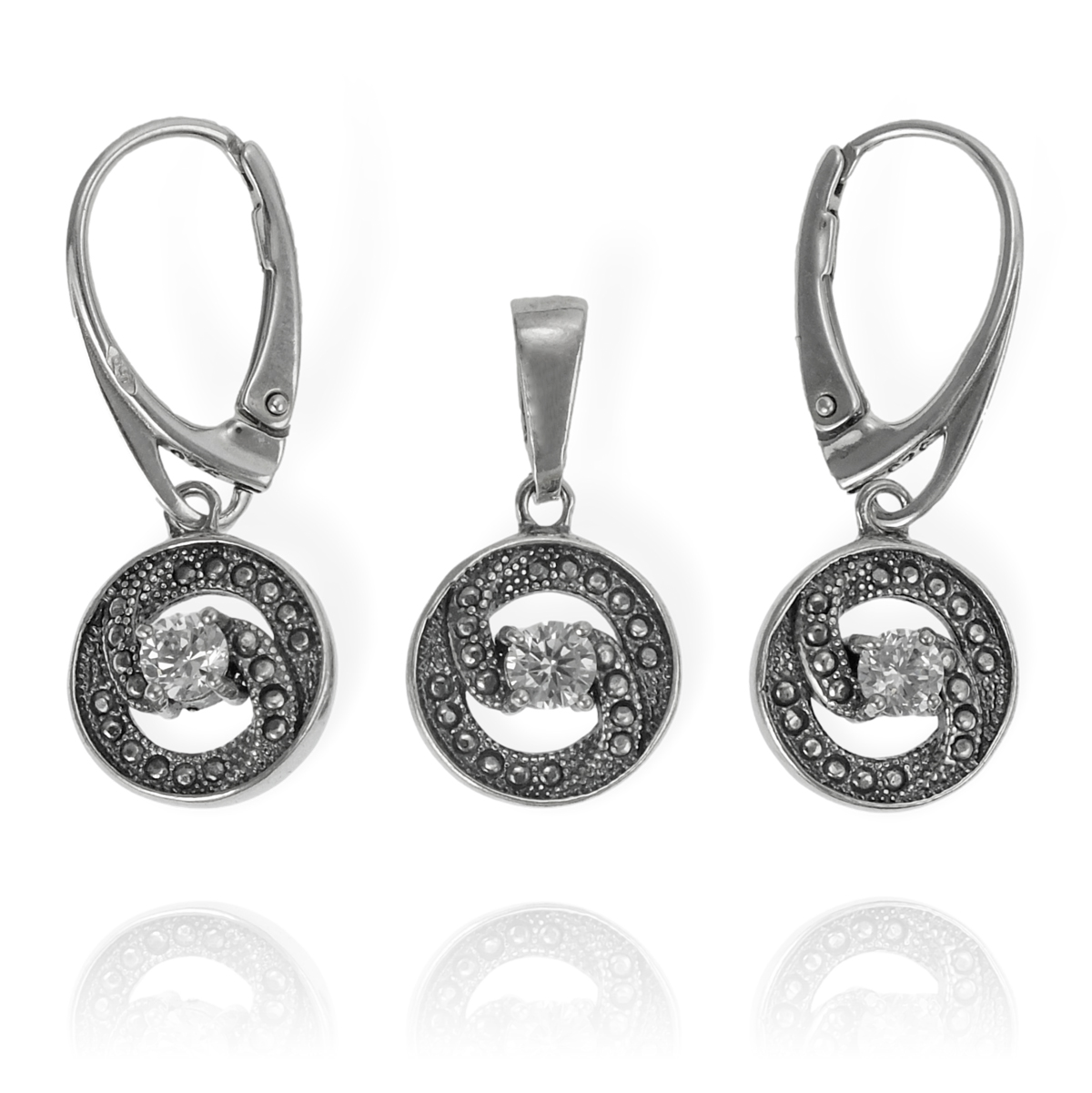 Piękny Srebrny Oksydowany Komplet z Cyrkoniami !