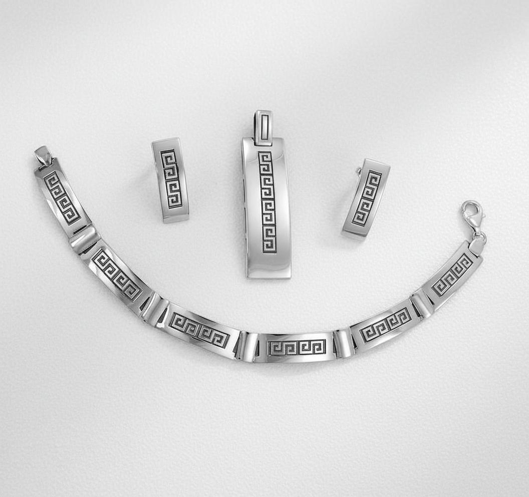 Piękny Srebrny Oksydowany Komplet z Greckim Wzorem !