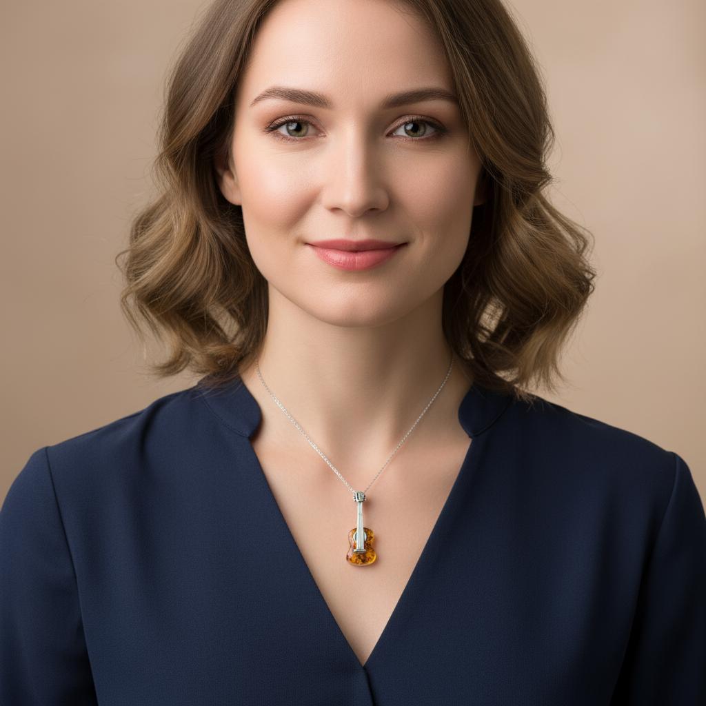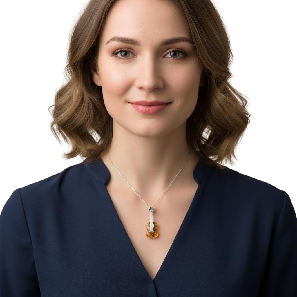 Piękny Srebrny Oksydowany Wisiorek - Gitara z Bursztynem