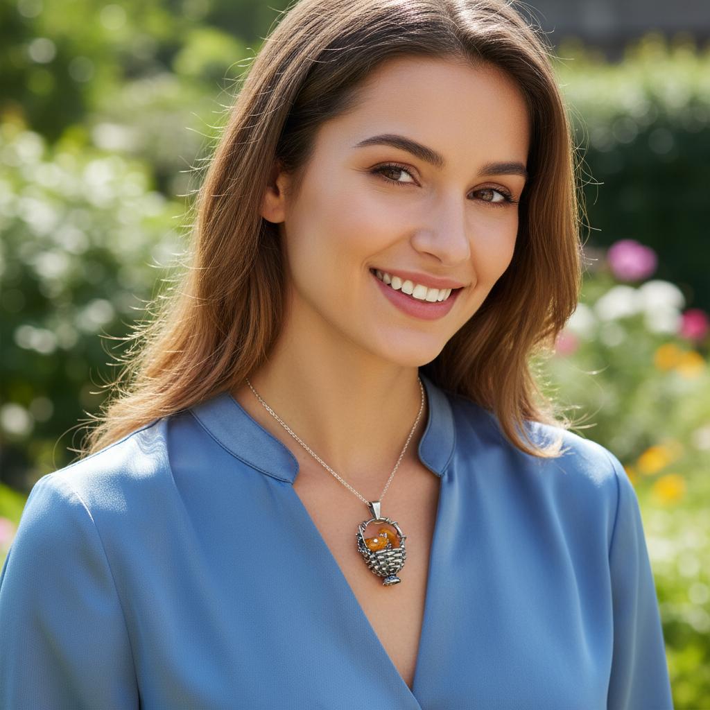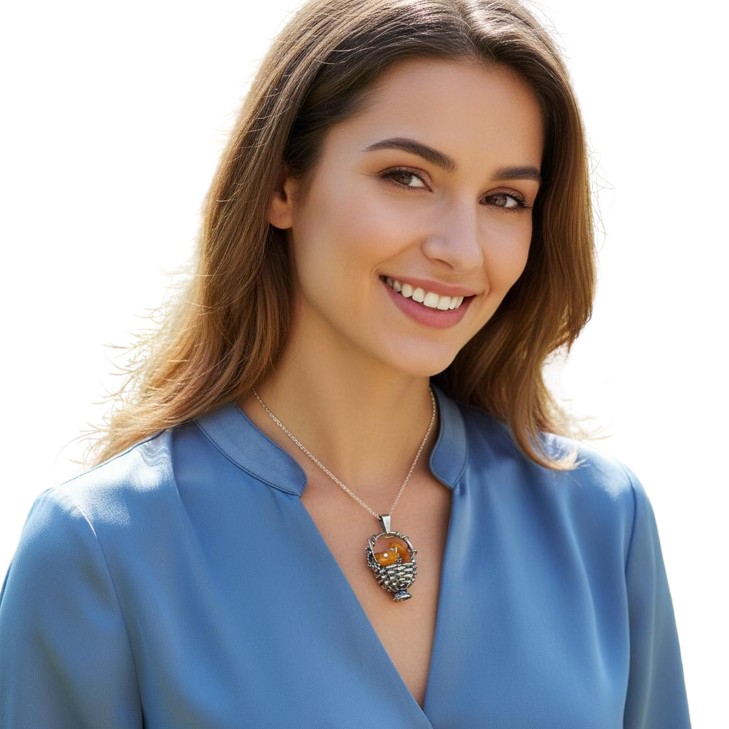 Piękny Srebrny Wisiorek Kosz, Koszyk z Bursztynami