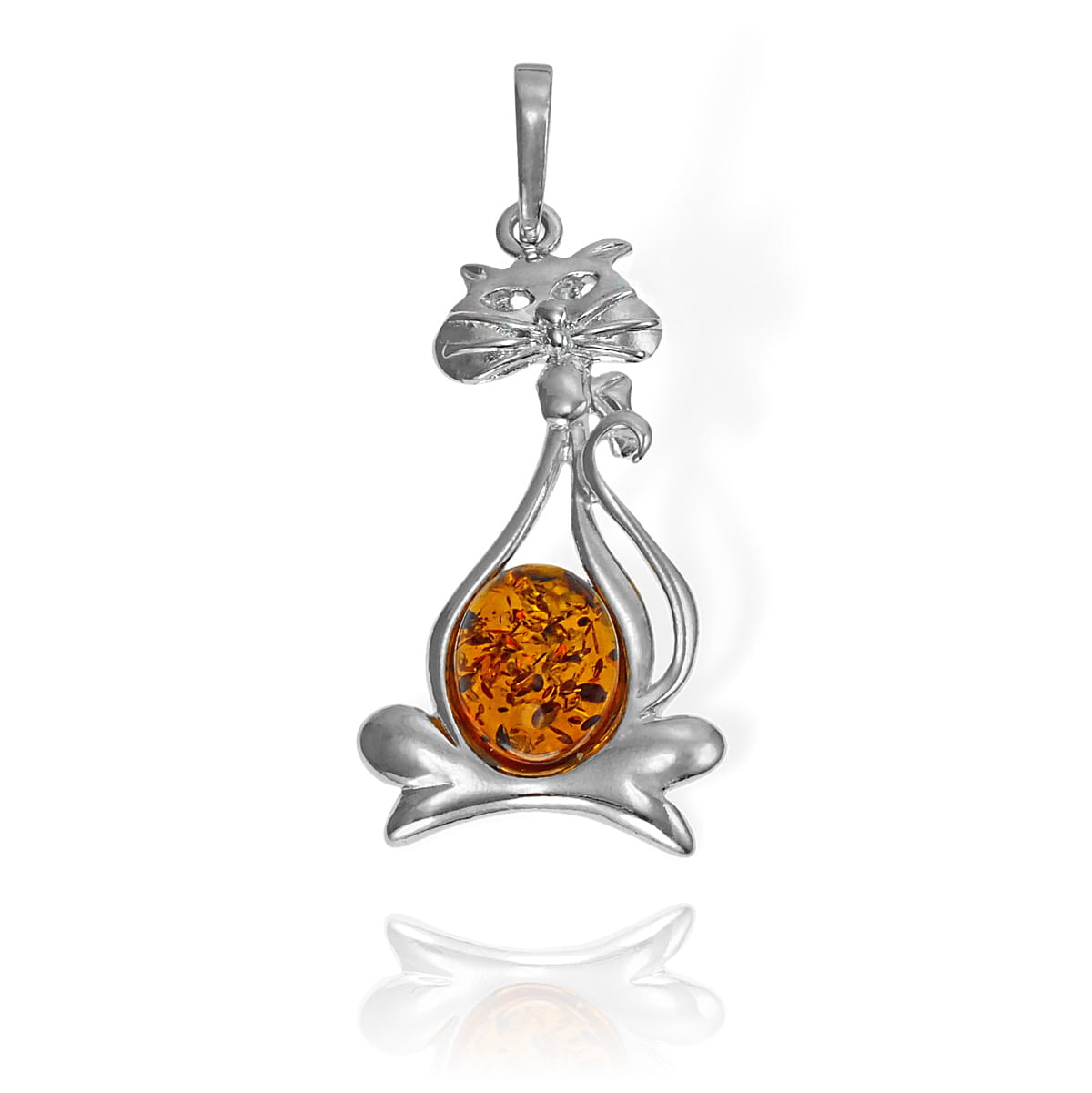 Piękny Srebrny Wisiorek Kot Kotek z Bursztynem