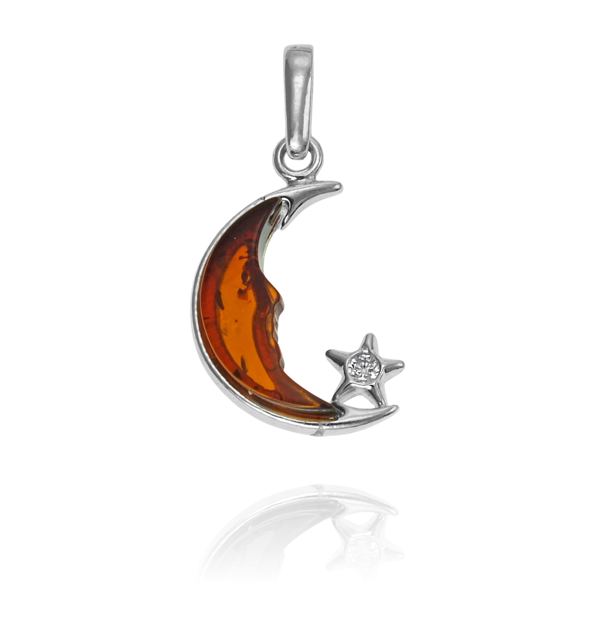 Piękny Srebrny Wisiorek Księżyc z Bursztynem i Cyrkonią