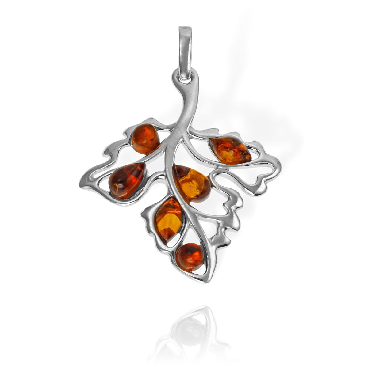 Piękny Srebrny Wisiorek Liść Listek z Bursztynami