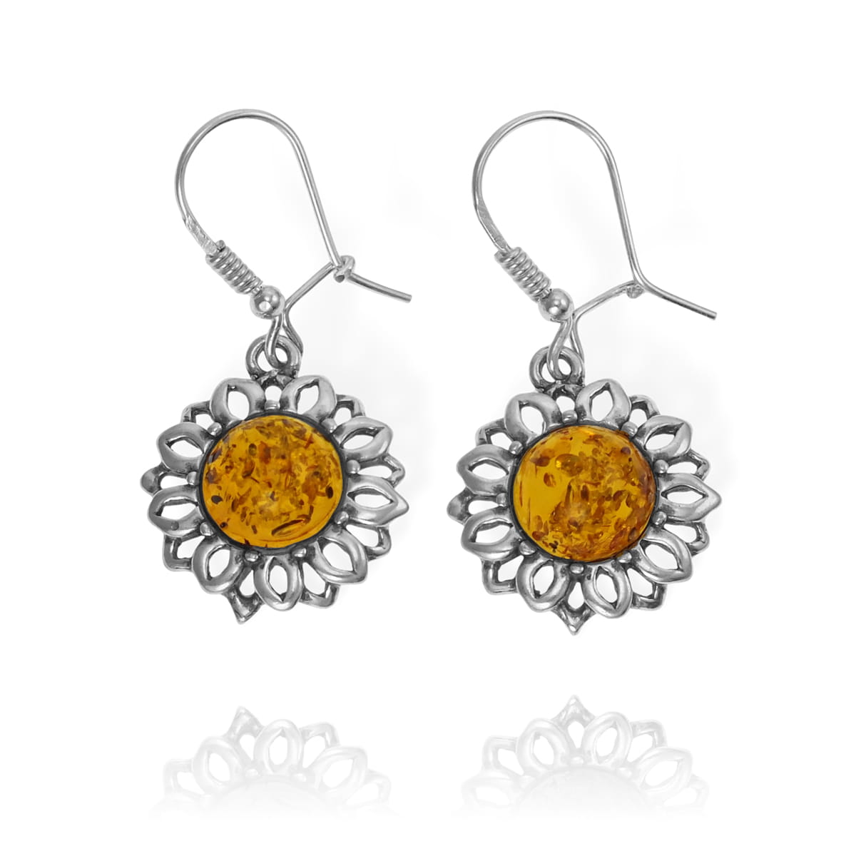 Srebrne Ażurowe Kolczyki Kwiatuszki z Bursztynami