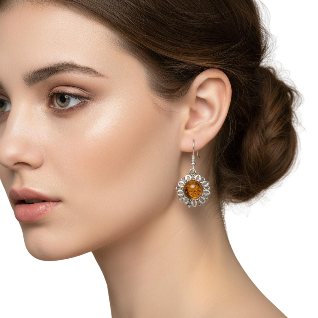 Srebrne Ażurowe Kolczyki Kwiatki Kwiatuszki z Bursztynem