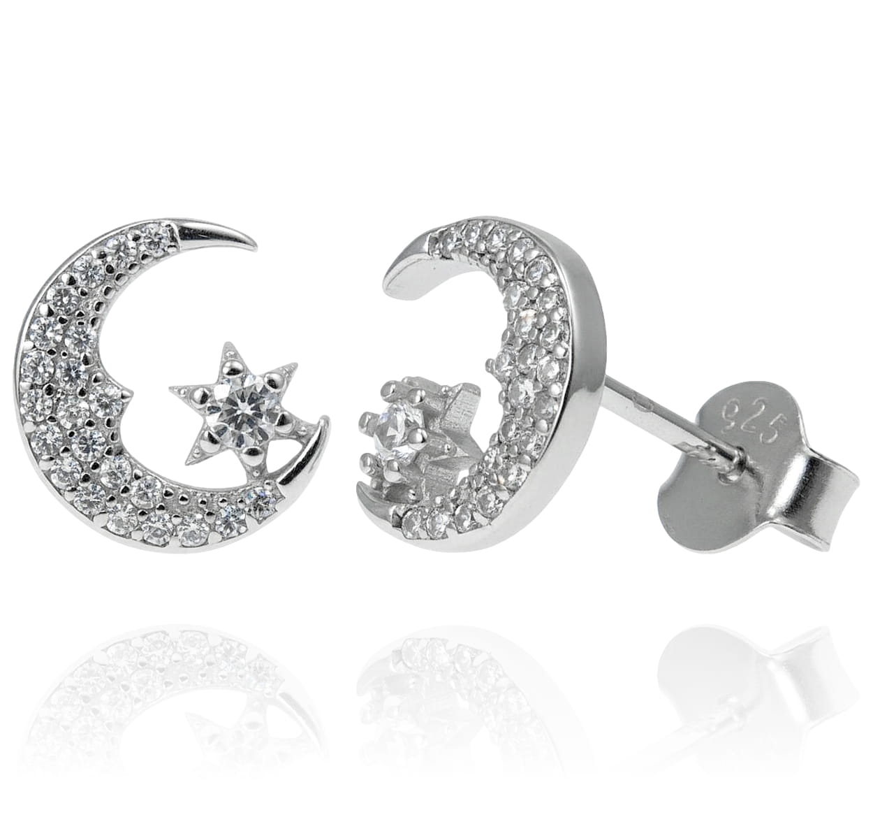 Srebrne Rodowane Kolczyki Księżyc z Gwiazdką z Cyrkoniami