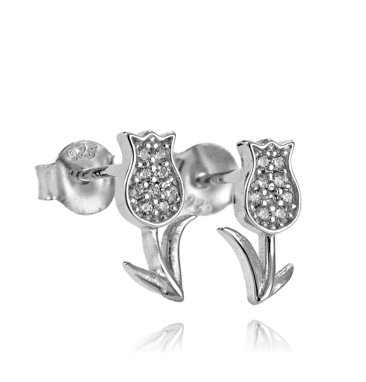 Srebrne Rodowane Kolczyki Kwiatuszki, Tulipany z Cyrkoniami