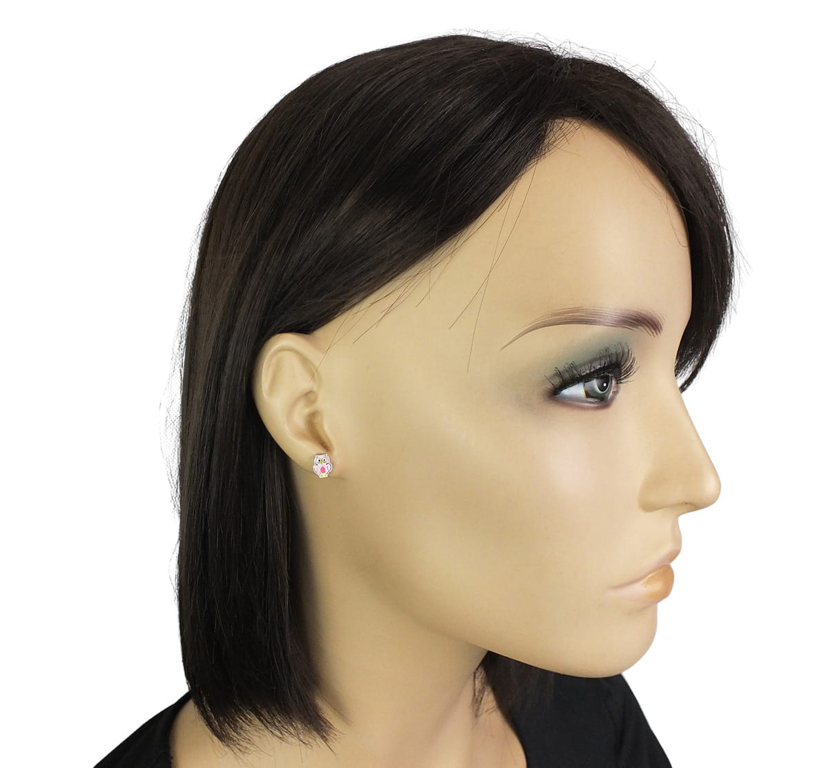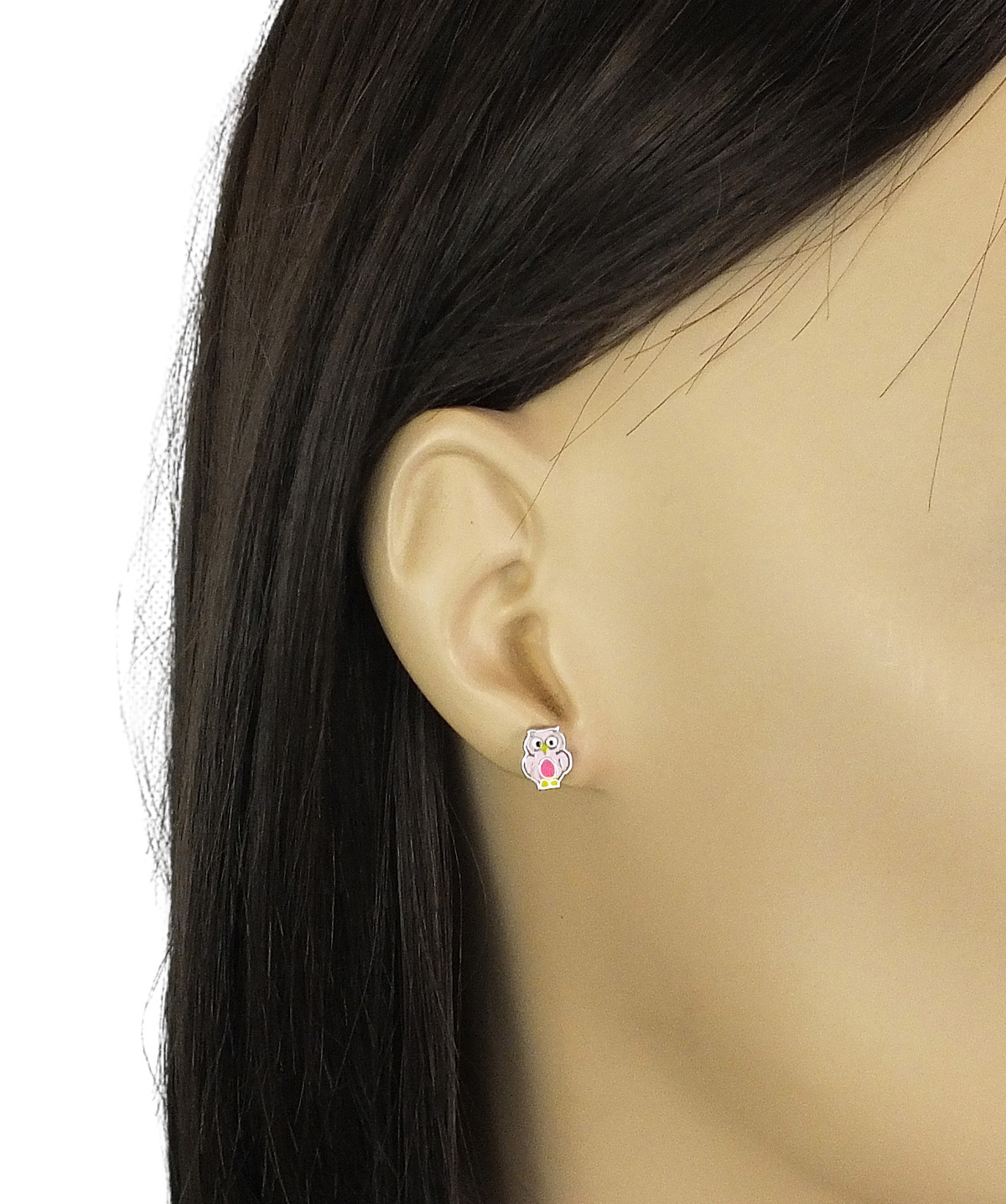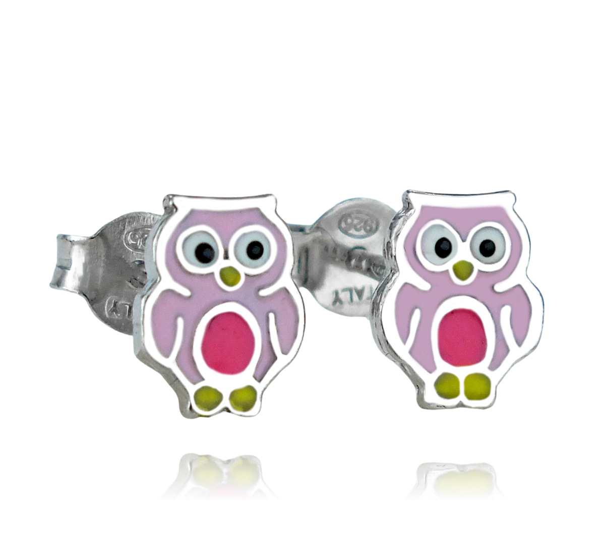 Srebrne Rodowane Kolczyki Różowe Sowy Sówki na Sztyft