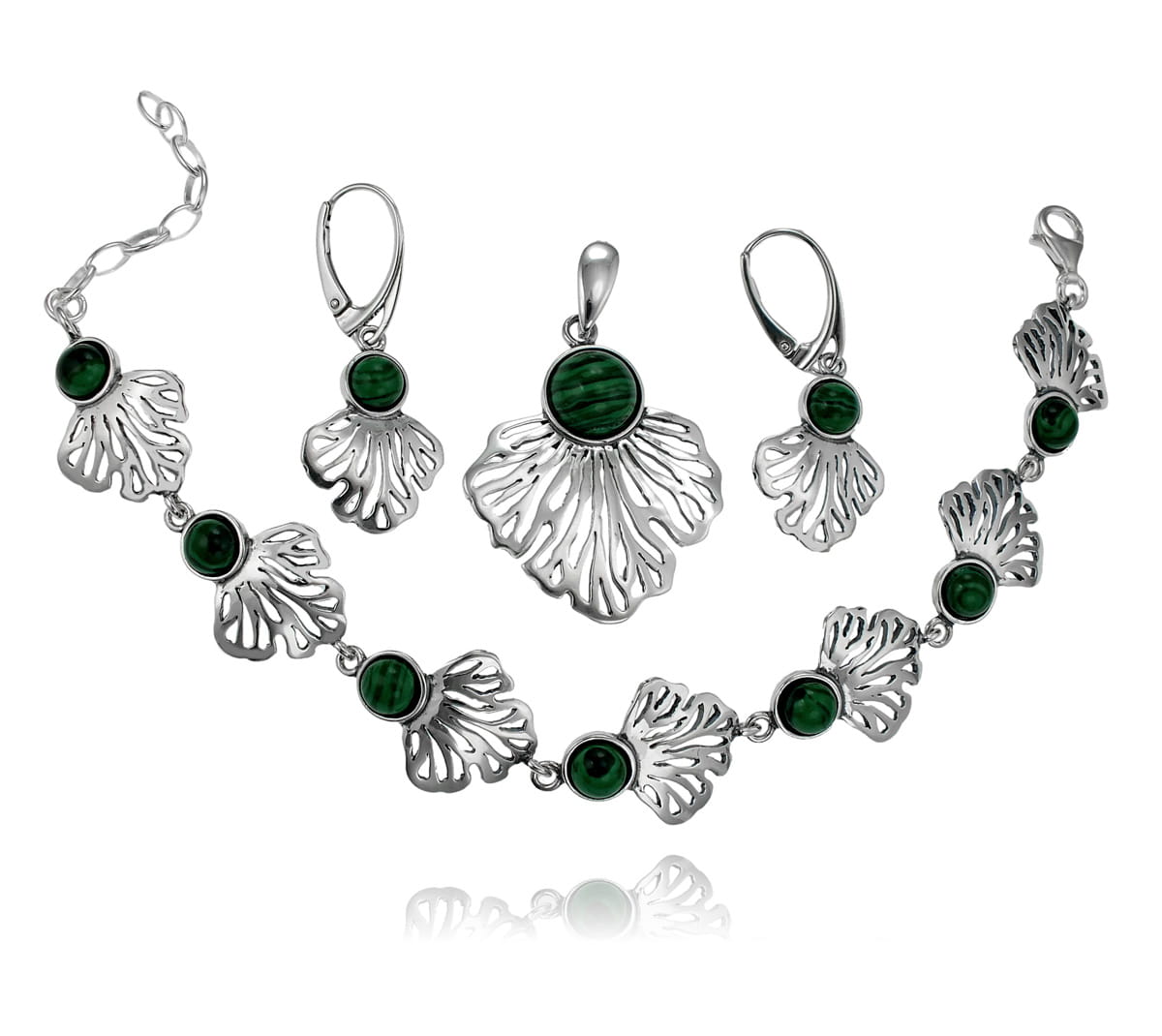 Srebrny Ażurowy Oksydowany Komplet z Malachitem Malachitami
