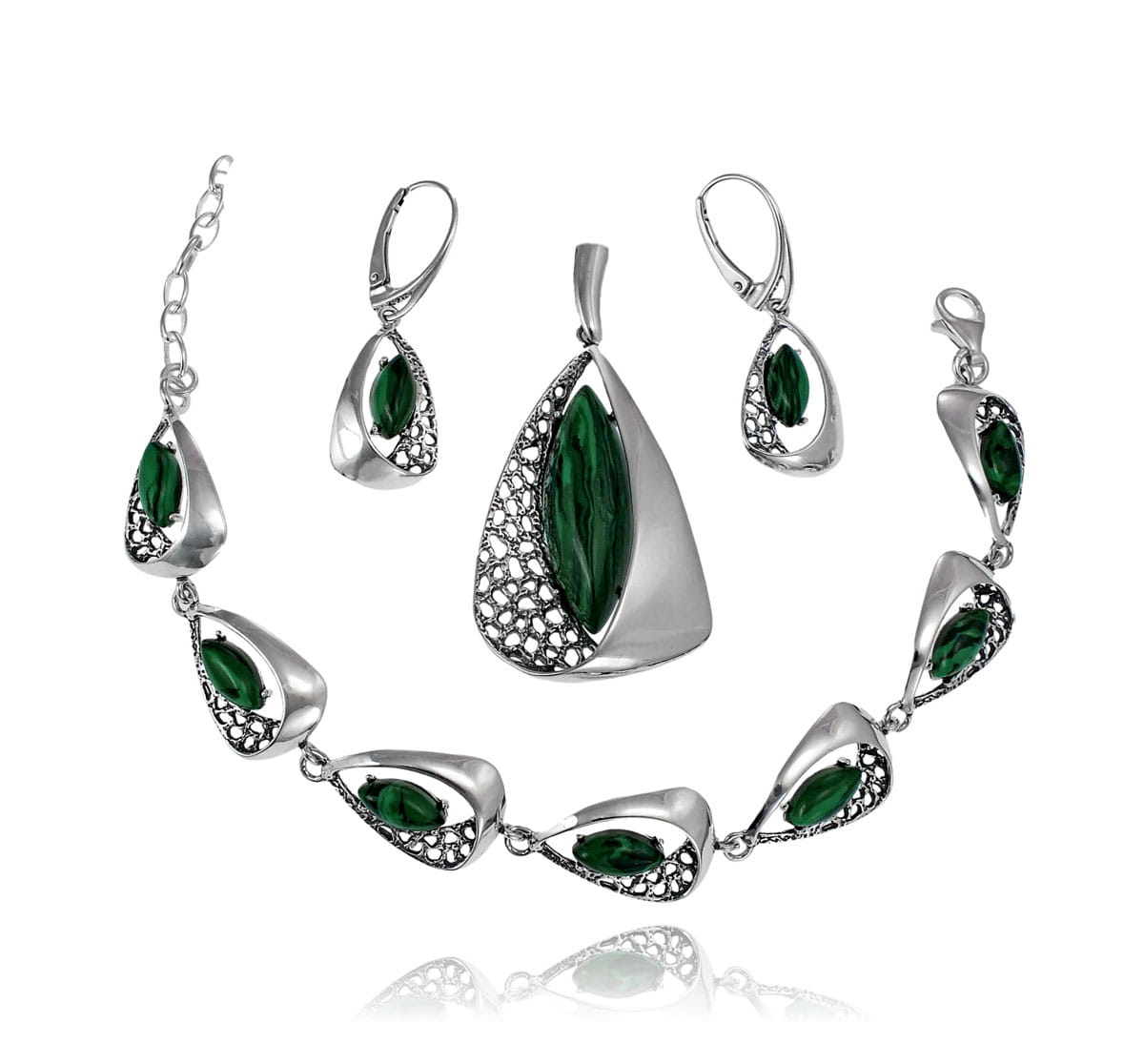 Srebrny Efektowny Oksydowany Komplet z Malachitem