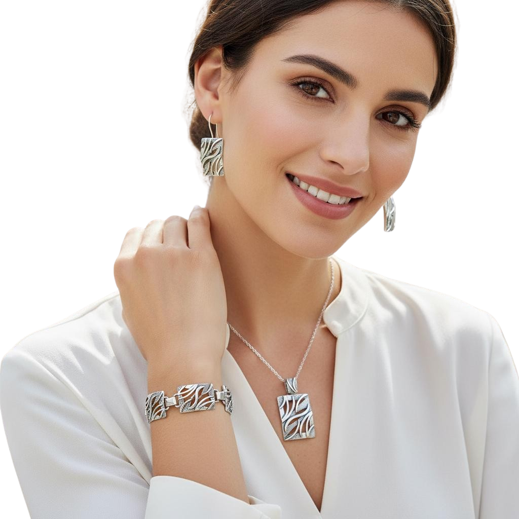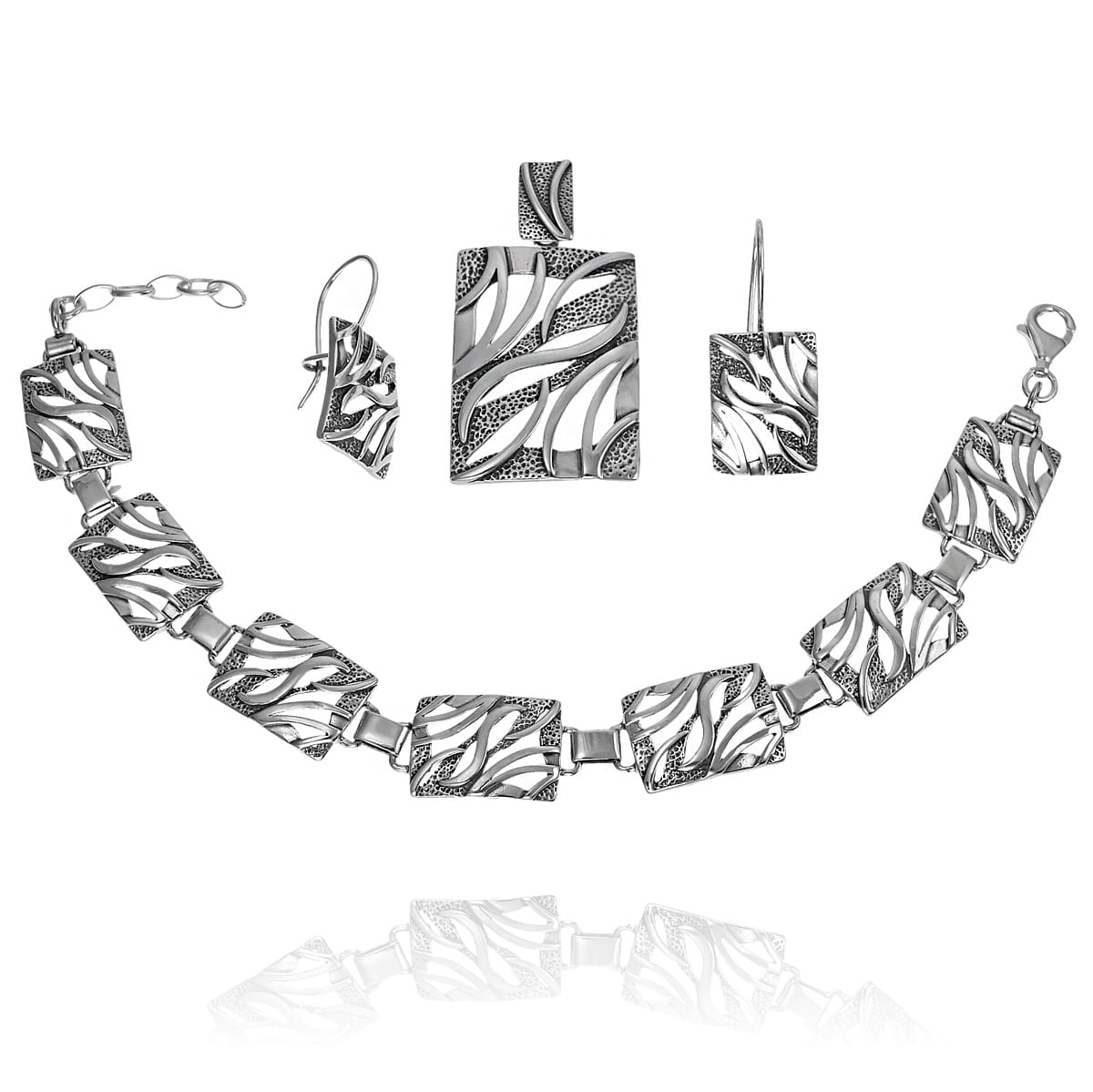 Szerokość - Bransoletka 1,2 cm. Wisiorek 2,1 cm. Kolczyki 1,3 cm.