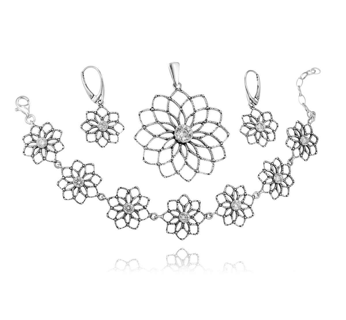 Srebrny Oksydowany Ażurowy Komplet Kwiatki z Cyrkoniami