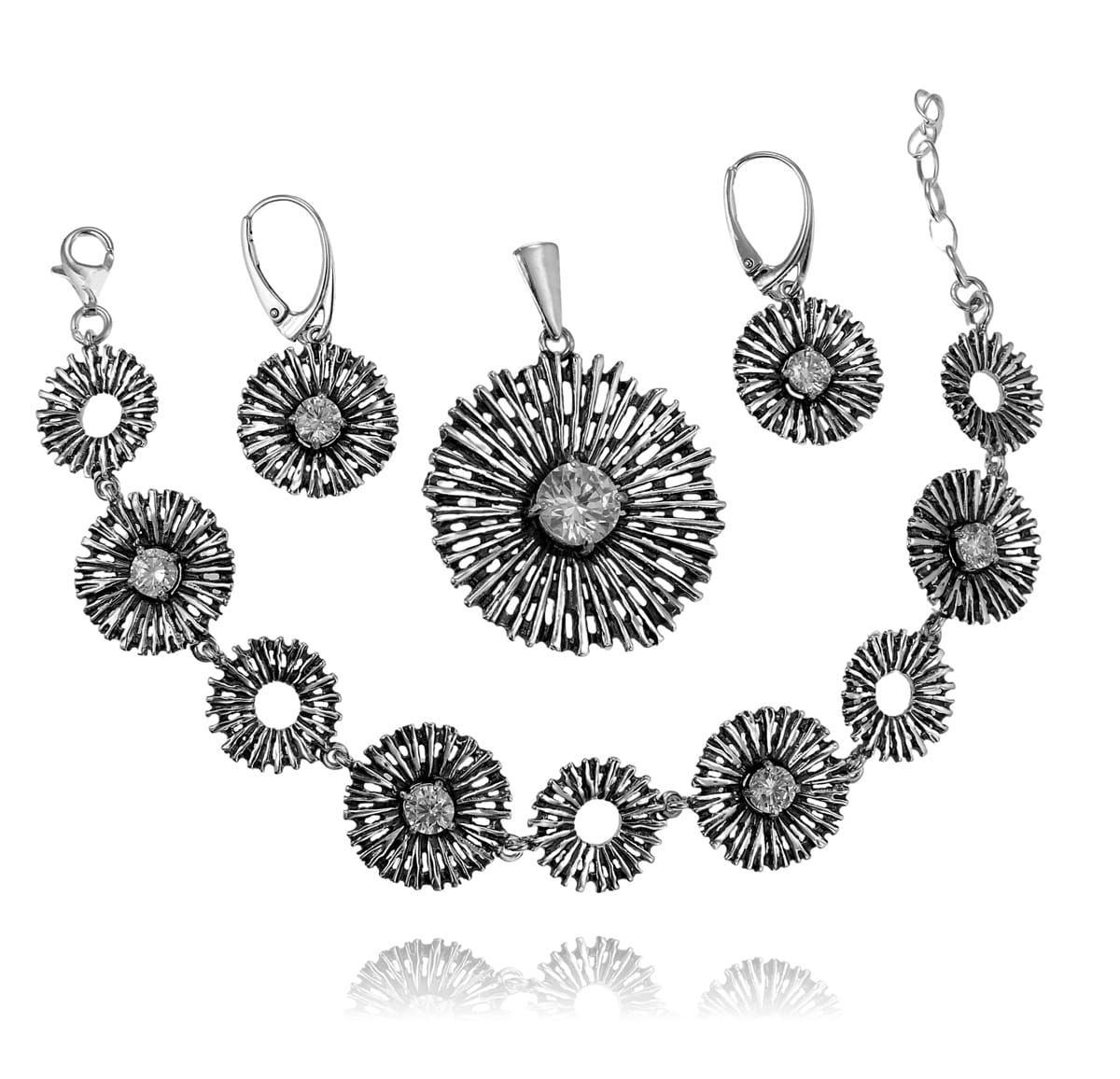 Srebrny Oksydowany Ażurowy Komplet z Cyrkoniami