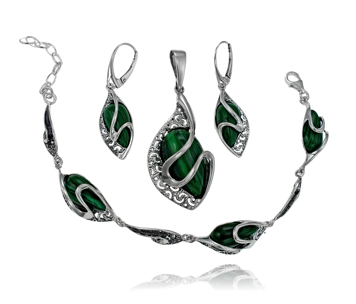 Srebrny Oksydowany Efektowny Komplet z Malachitem Malachitami