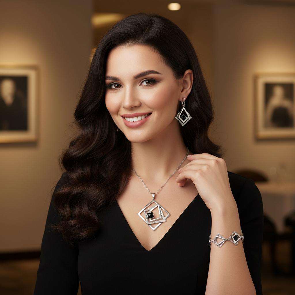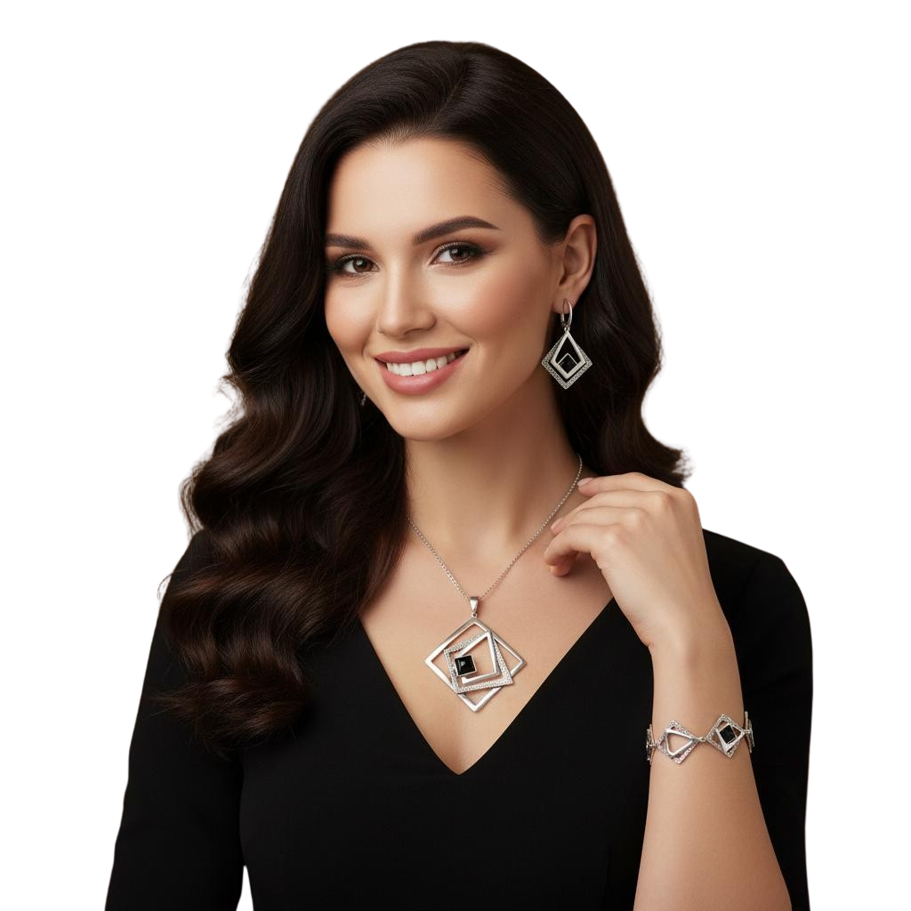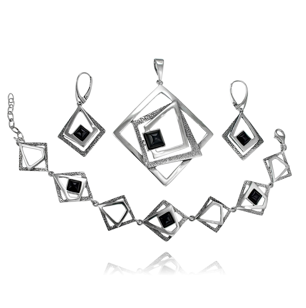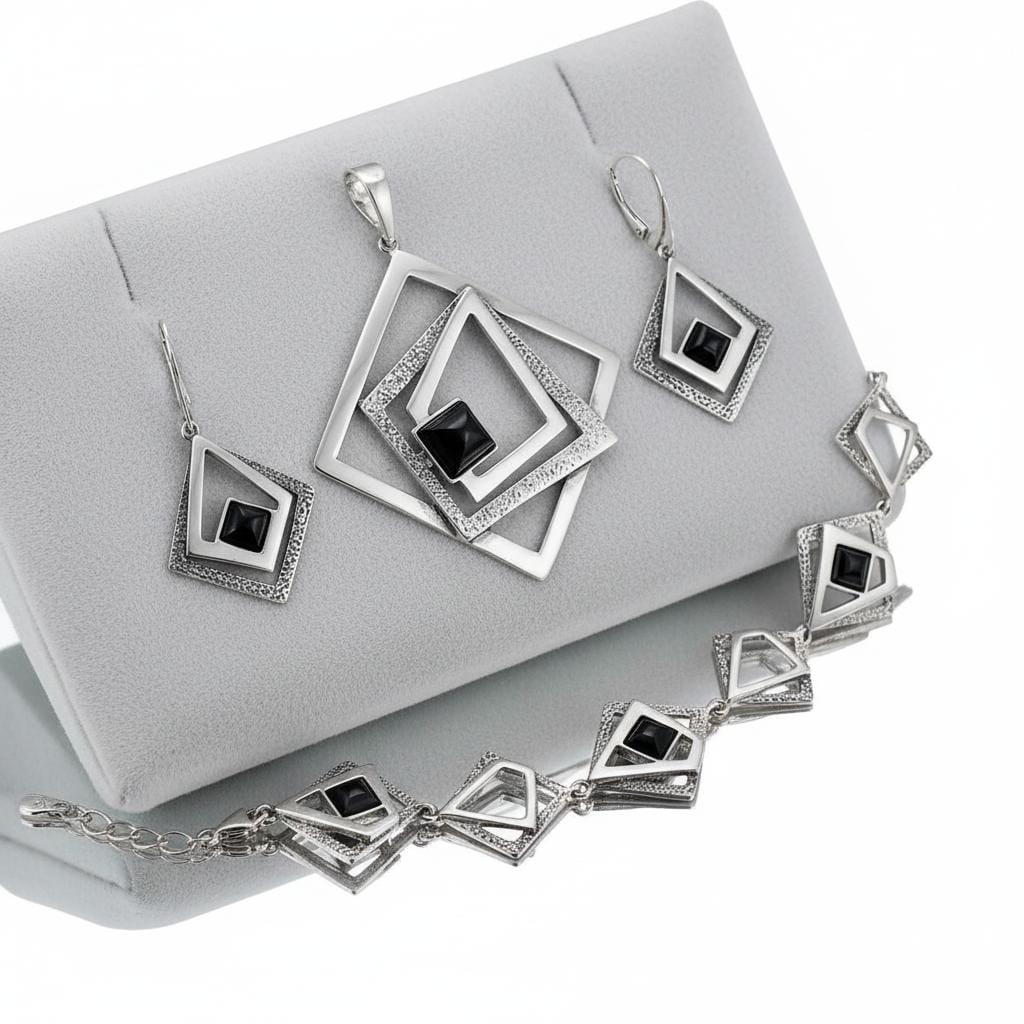 Srebrny Oksydowany Komplet Fantazyjne Romby z Onyksem Onyksami
