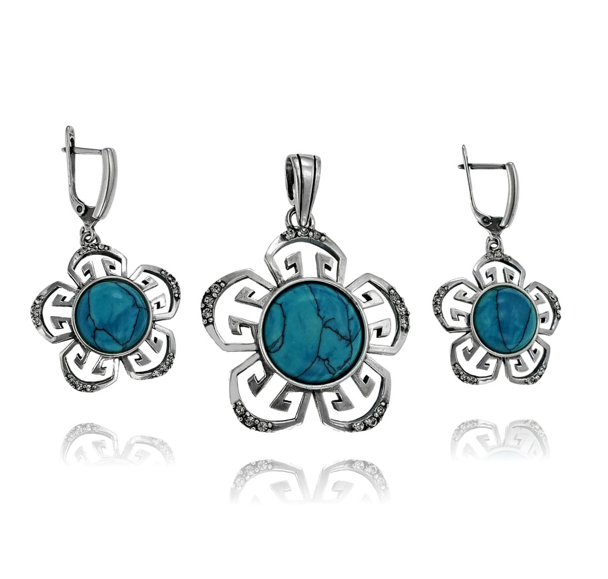 Srebrny Oksydowany Komplet Kwiatek z Turkusami i Cyrkoniami Turkus
