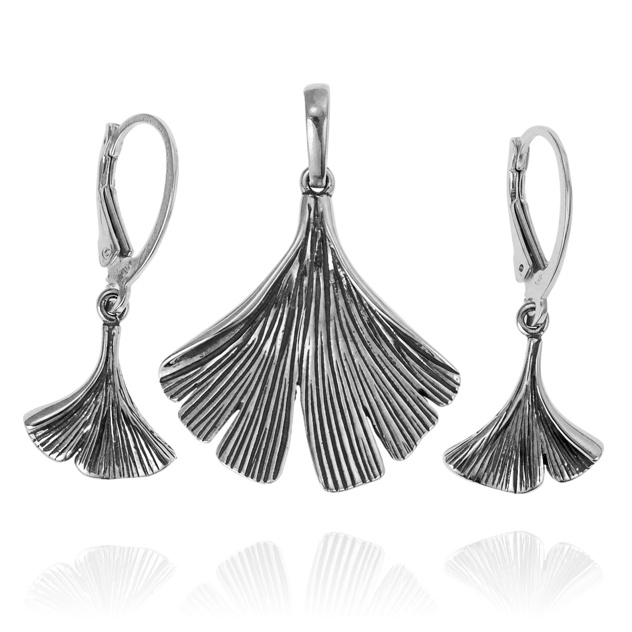 Srebrny Oksydowany Komplet Liść Miłorzębu