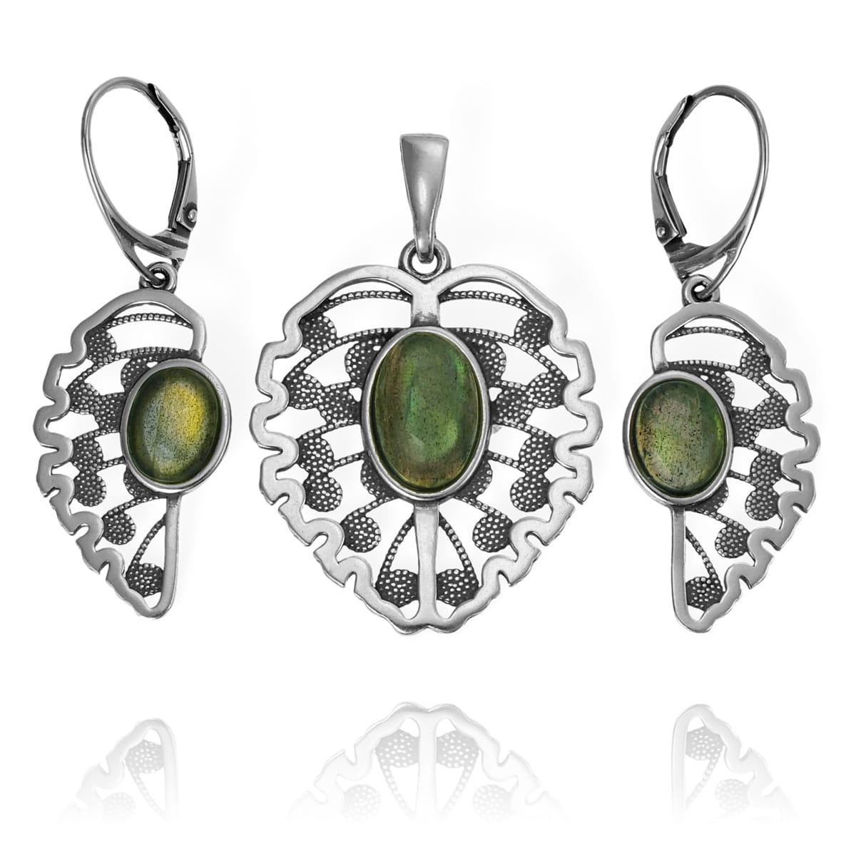 Srebrny Oksydowany Efektowny Komplet Liść Liscie z Labradorytem