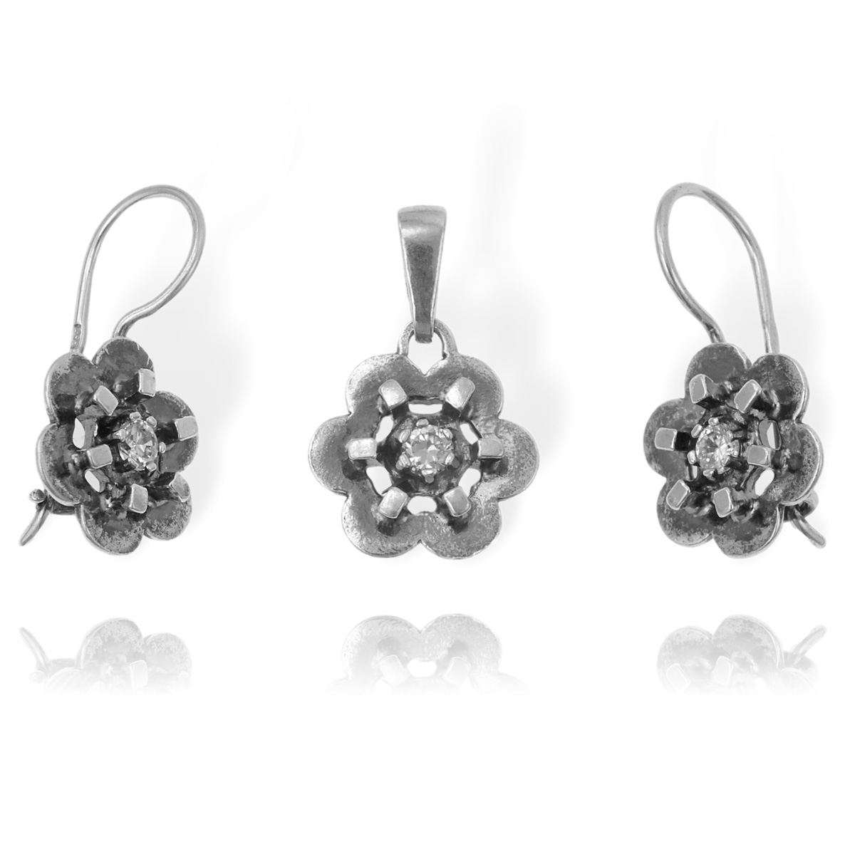 Piękny Srebrny Oksydowany Komplet z Cyrkoniami