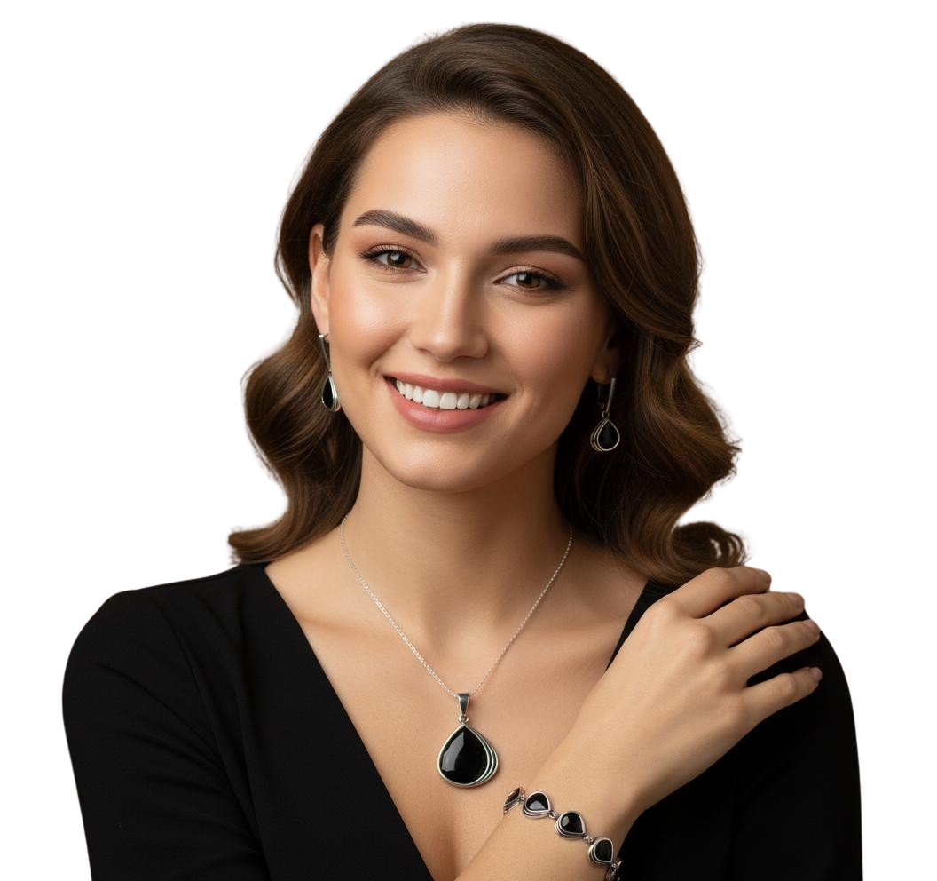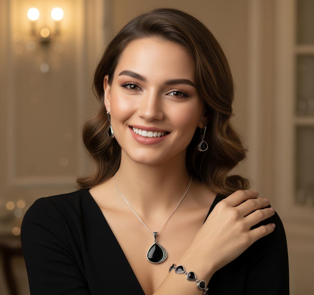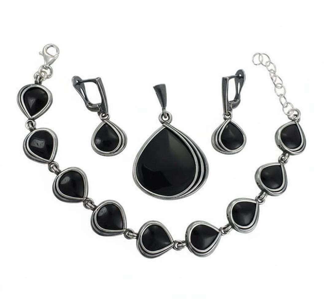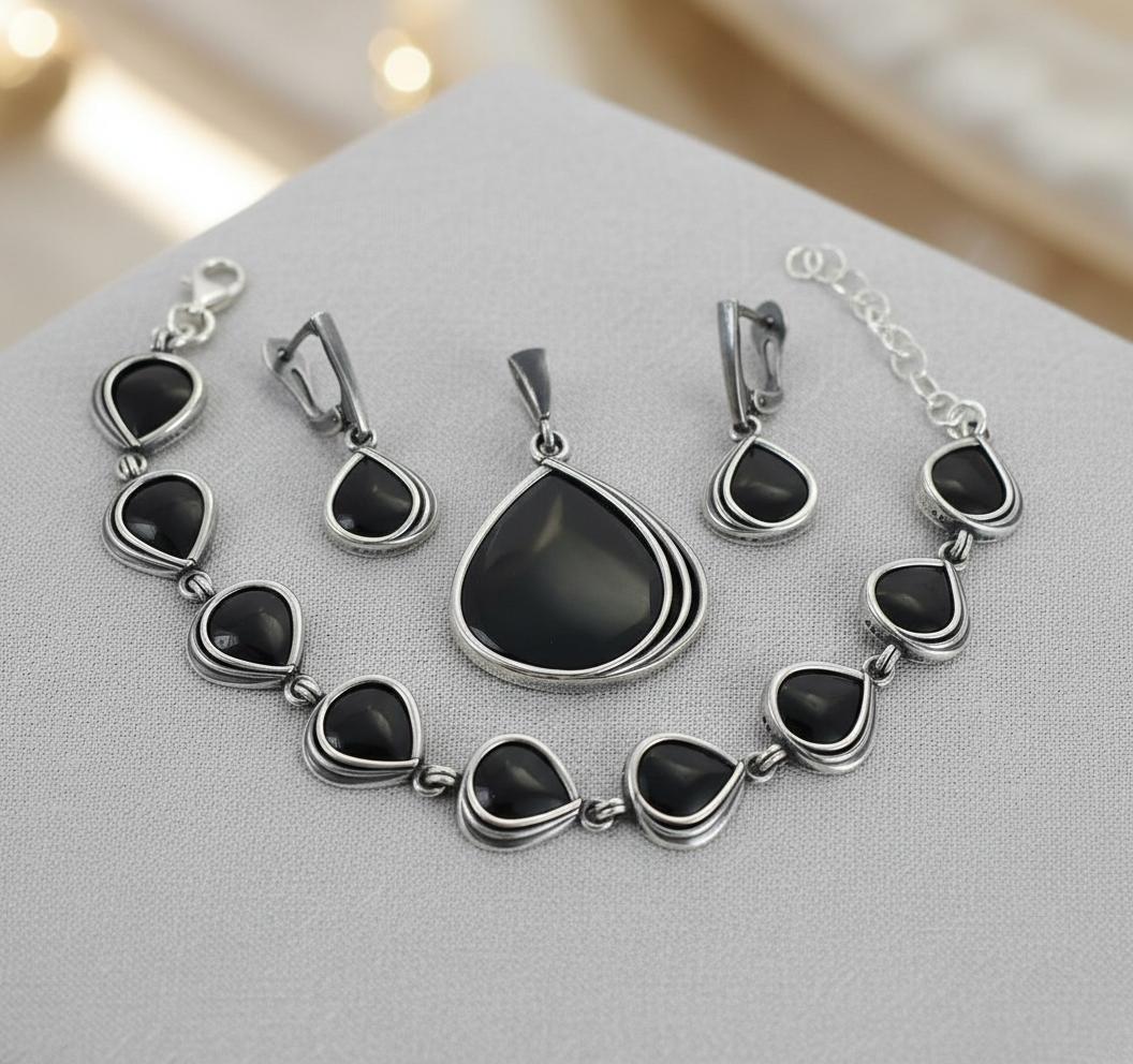 Srebrny Oksydowany Komplet z Czarnym Kwarcem !