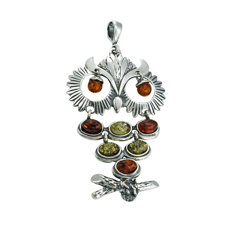 Srebrny Oksydowany Wisiorek Sowa z Bursztynami !