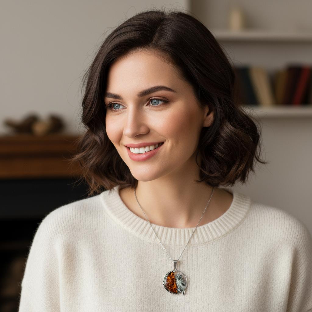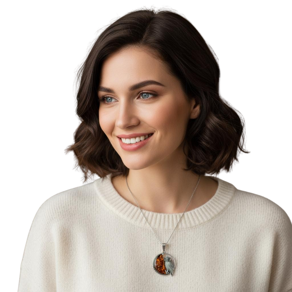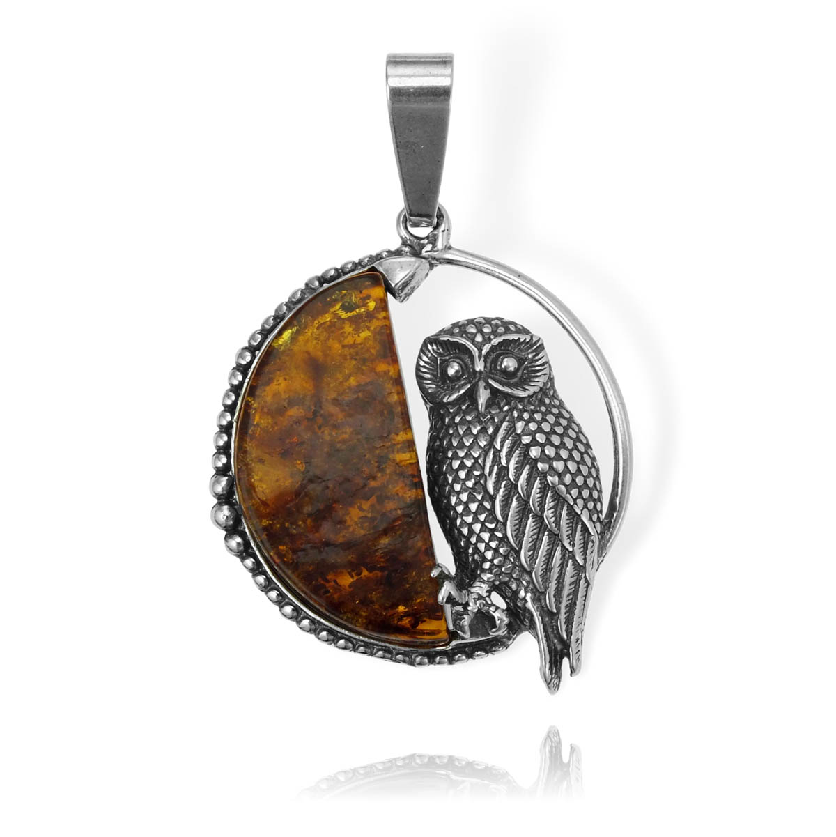 Srebrny Oksydowany Wisiorek Sowa z Bursztynem