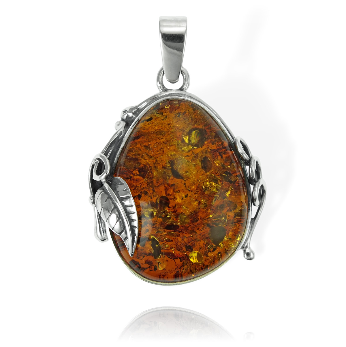 Srebrny Oksydowany Wisiorek z Bursztynem z Listkiem