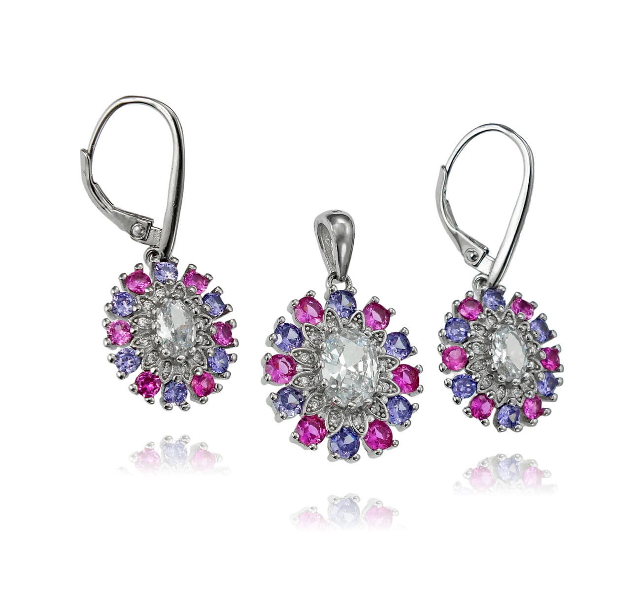 Srebrny Rodowany Komplet Markiza z Kolorowymi Cyrkoniami