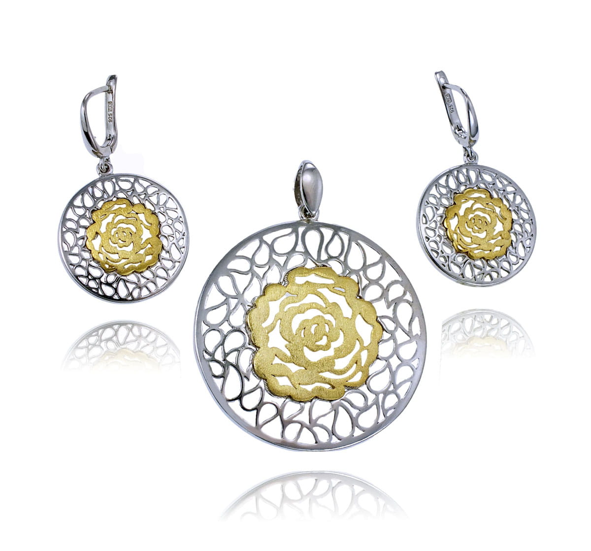 Srebrny Rodowany i Pozłacany Ażurowy Komplet Róża