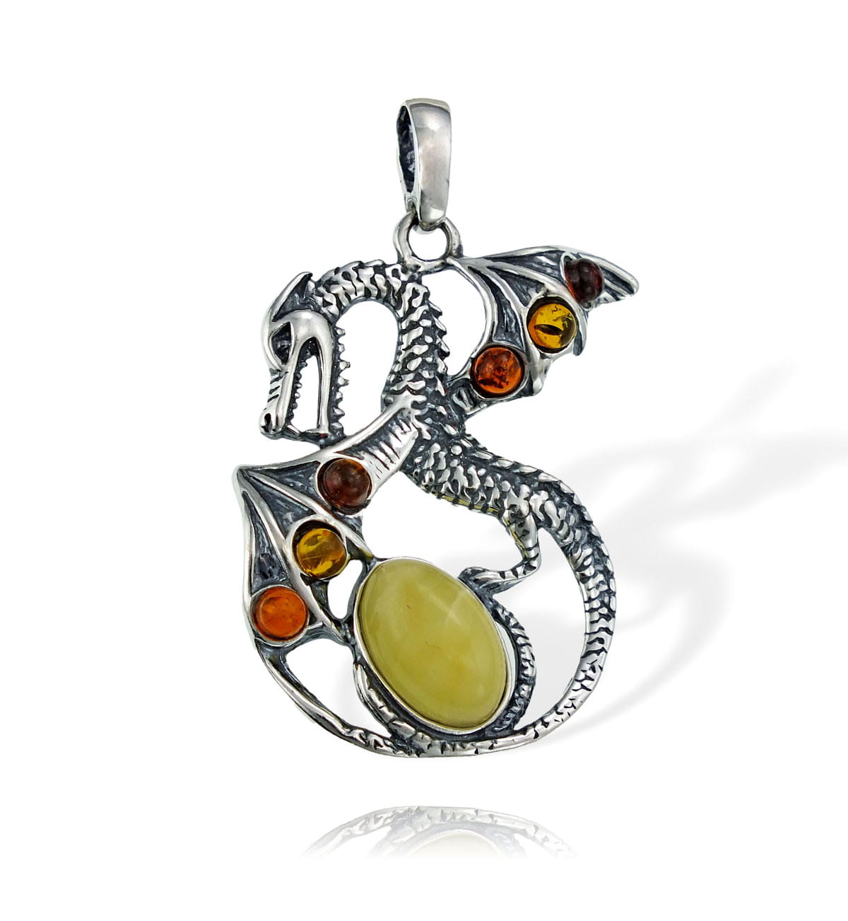 Srebrny Wisiorek Oksydowany Efektowny Smok z Bursztynem