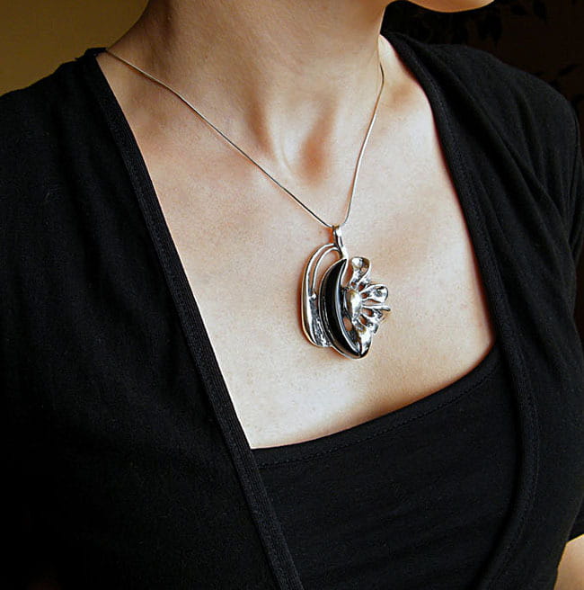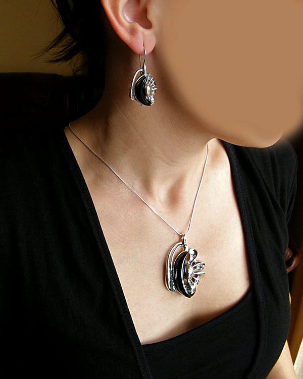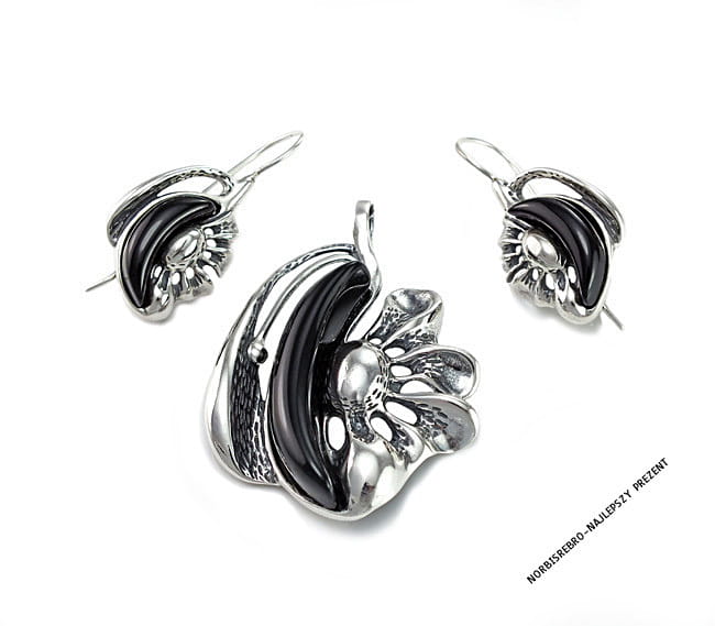 Efektowny Srebrny Komplet Kwiat z Onyksami Onyksem