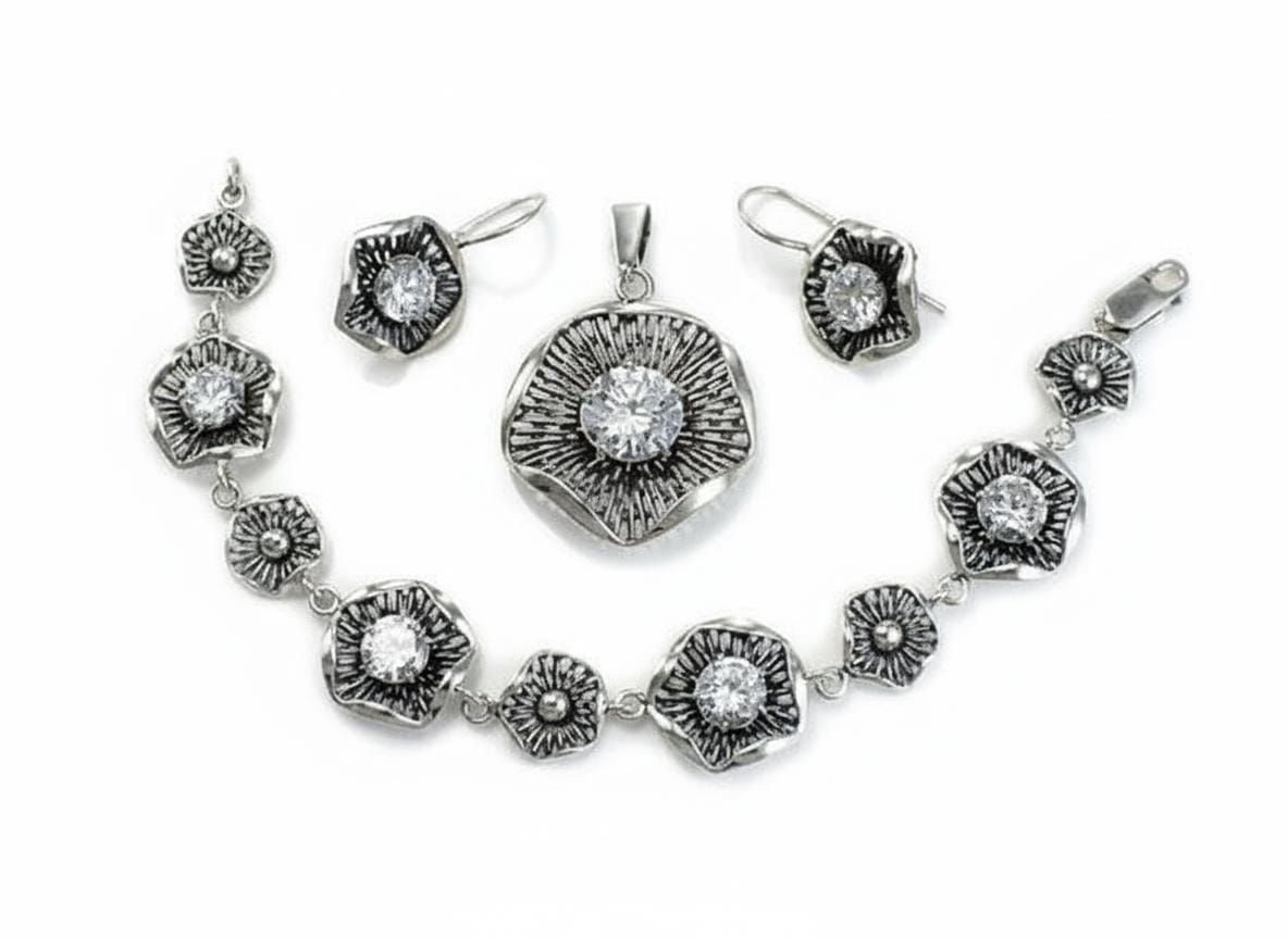 Piękny Srebrny Komplet z Cyrkoniami Ażurowy !! C-1